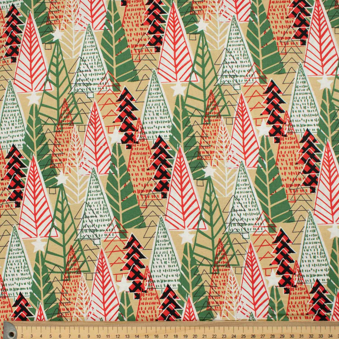 Christmas Collection Red & Green Christmas Tree on Beige Cotton Prints