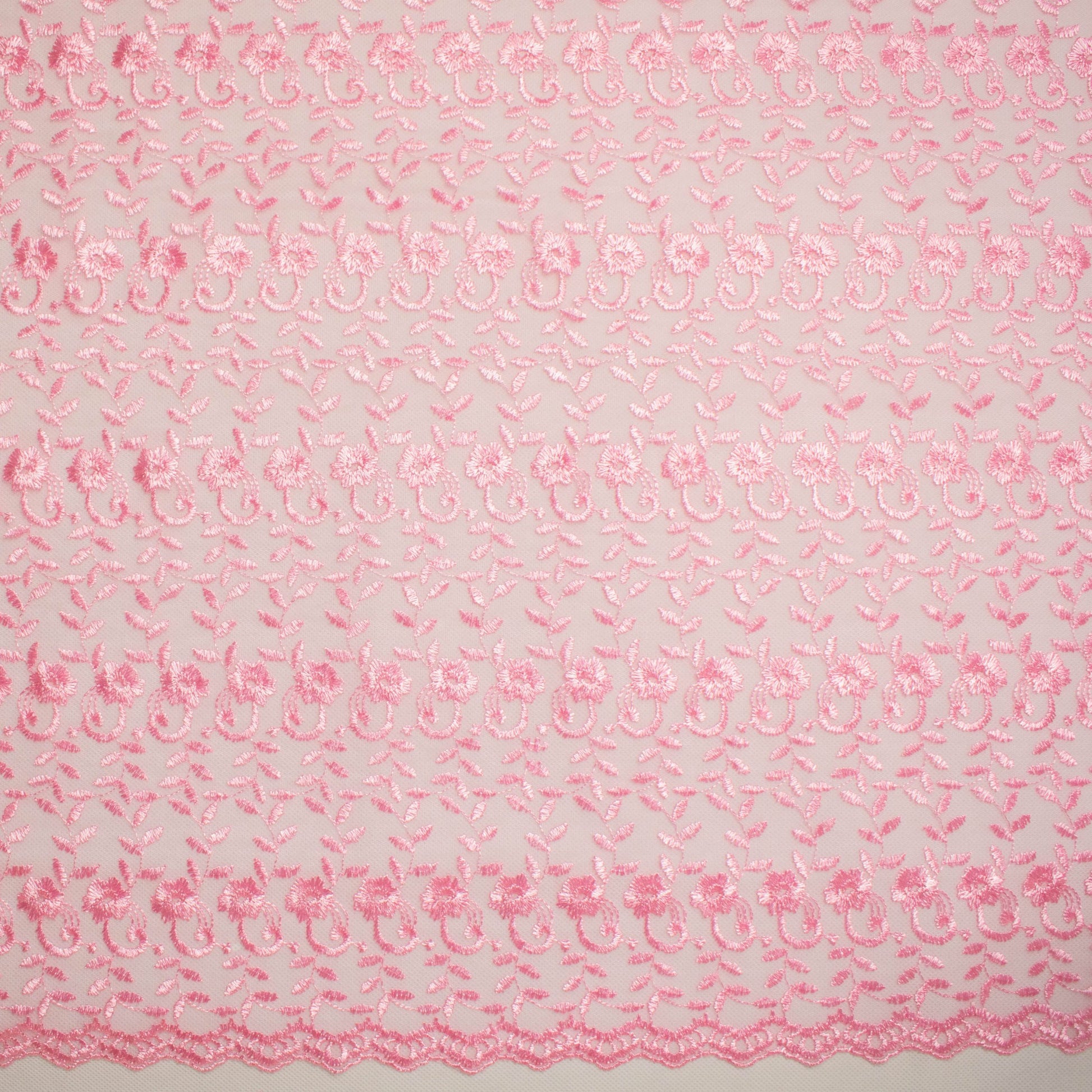 A densely Embroidered Lace on a tulle net backing with double scalloped edges. The embroidery comes in two sizes - A larger floral design and a smaller all over floral pattern. With over fifty colours to choose from, Our Embroidered Lace is the perfect choice for bridal wear, cocktail wear, evening wear as well as mother of the bride. Use a matching or contrasting colour from any of our beautiful Crepe Back Satins as an underlining to finish your garment.
