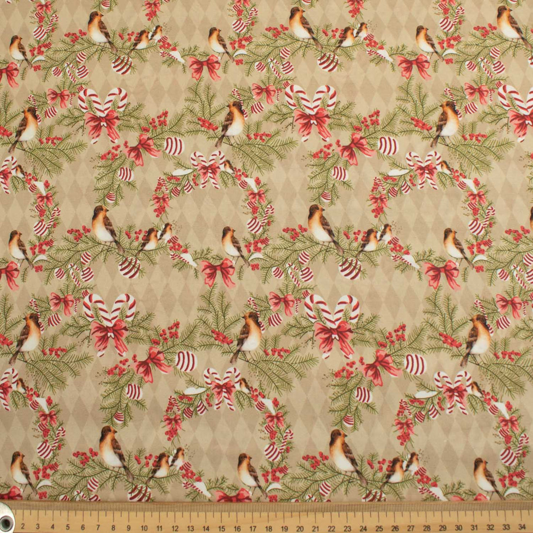 Christmas Cotton Prints Birds, Ribbon & Candy Canes on Beige