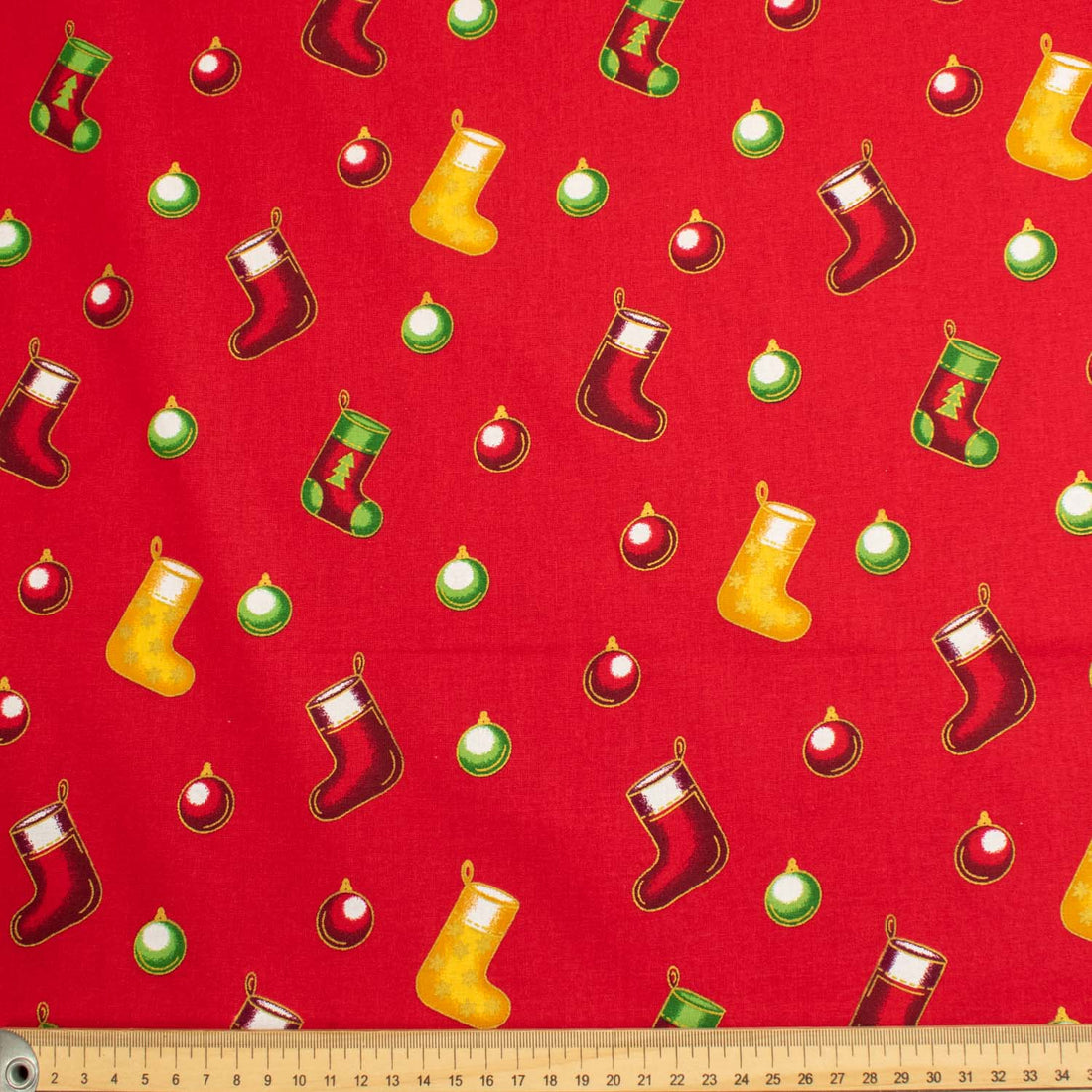Christmas Cotton Prints Christmas Bauble & Stocking on Red