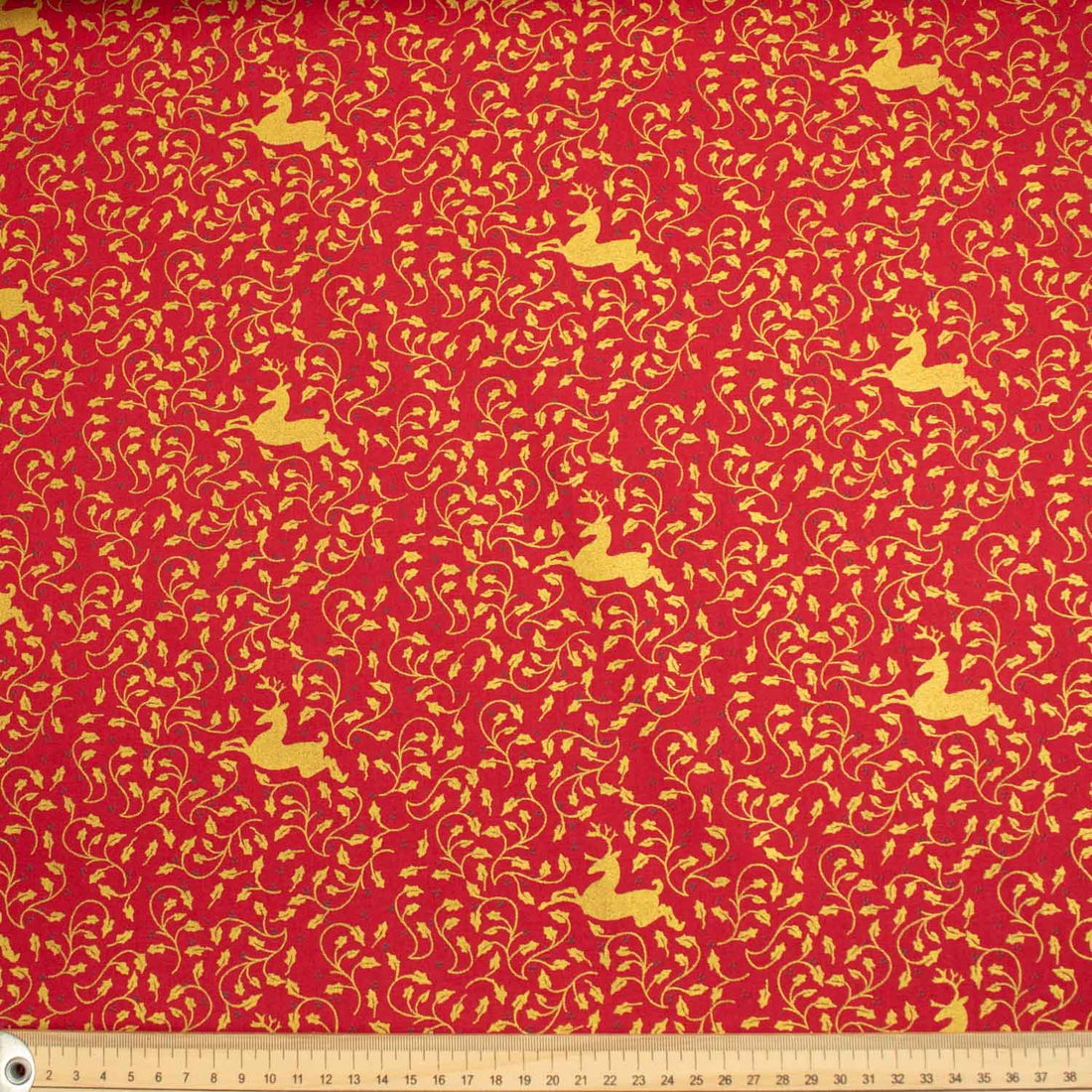 Christmas Cotton Prints Gold Reindeers & Vines on Red