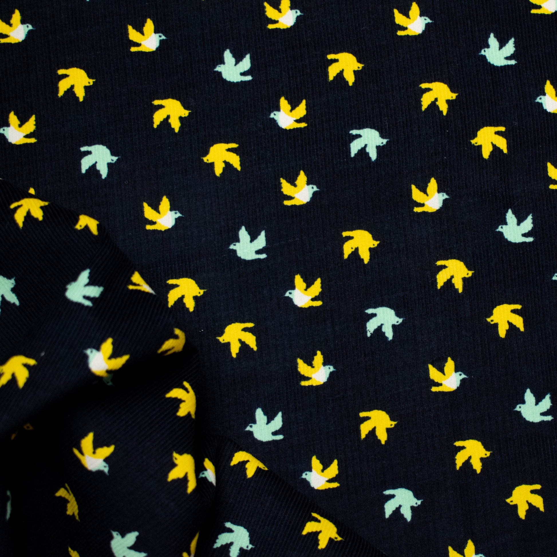 Cotton Corduroy Prints Design 35 Yellow & Blue Mini Birds on Navy