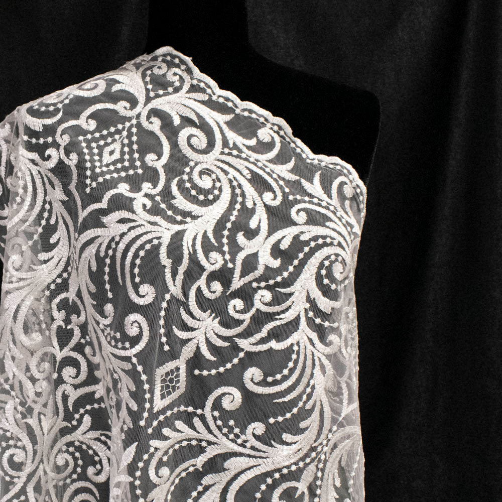 Designed on a sheer mesh base, the pattern features an elegant and richly detailed damask-style design, composed of ornate swirling vines, floral scrolls, and diamond lattice motifs. Ideal for bridalwear, evening gowns, or any couture statement piece, this fabric pairs soft femininity with classic embroidery detail.