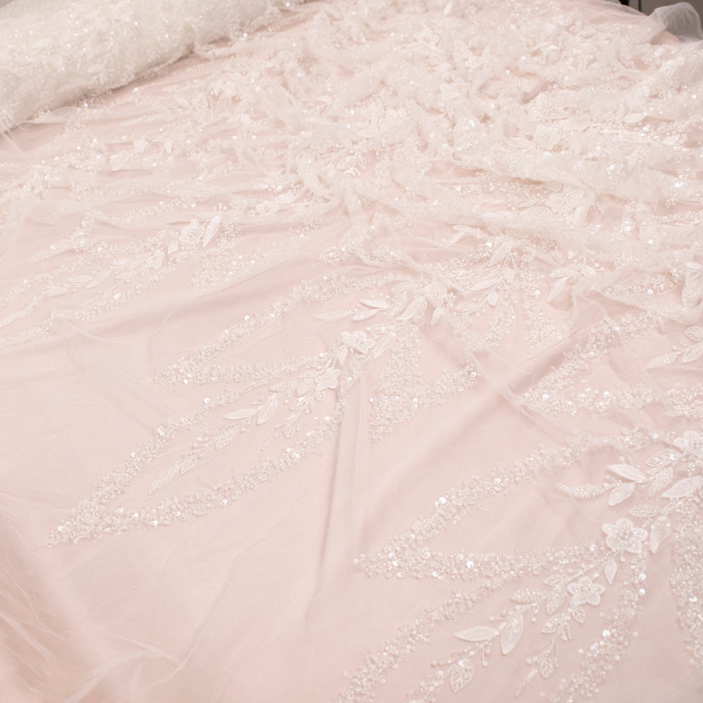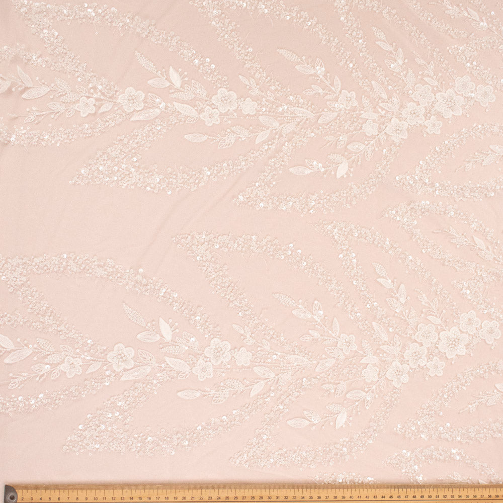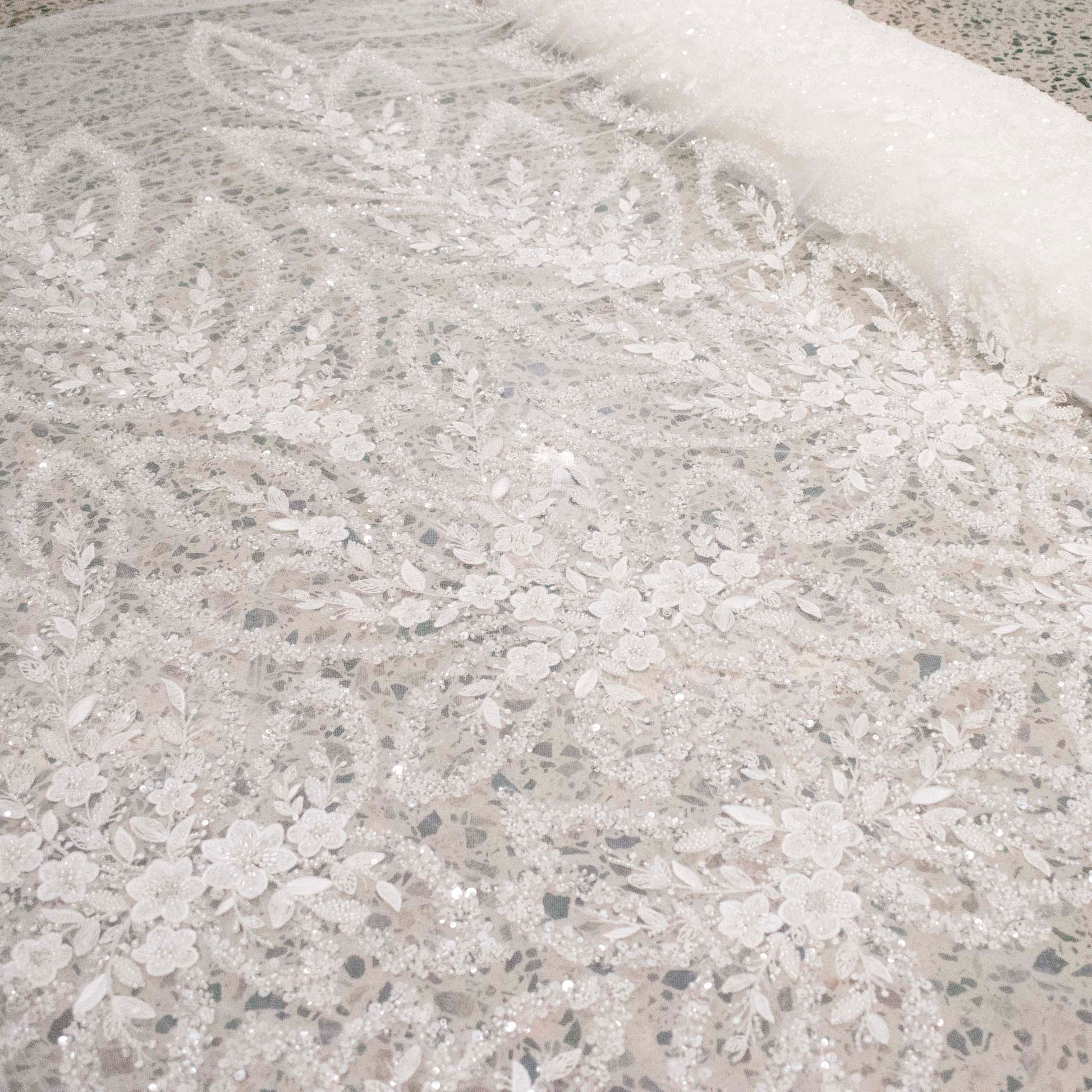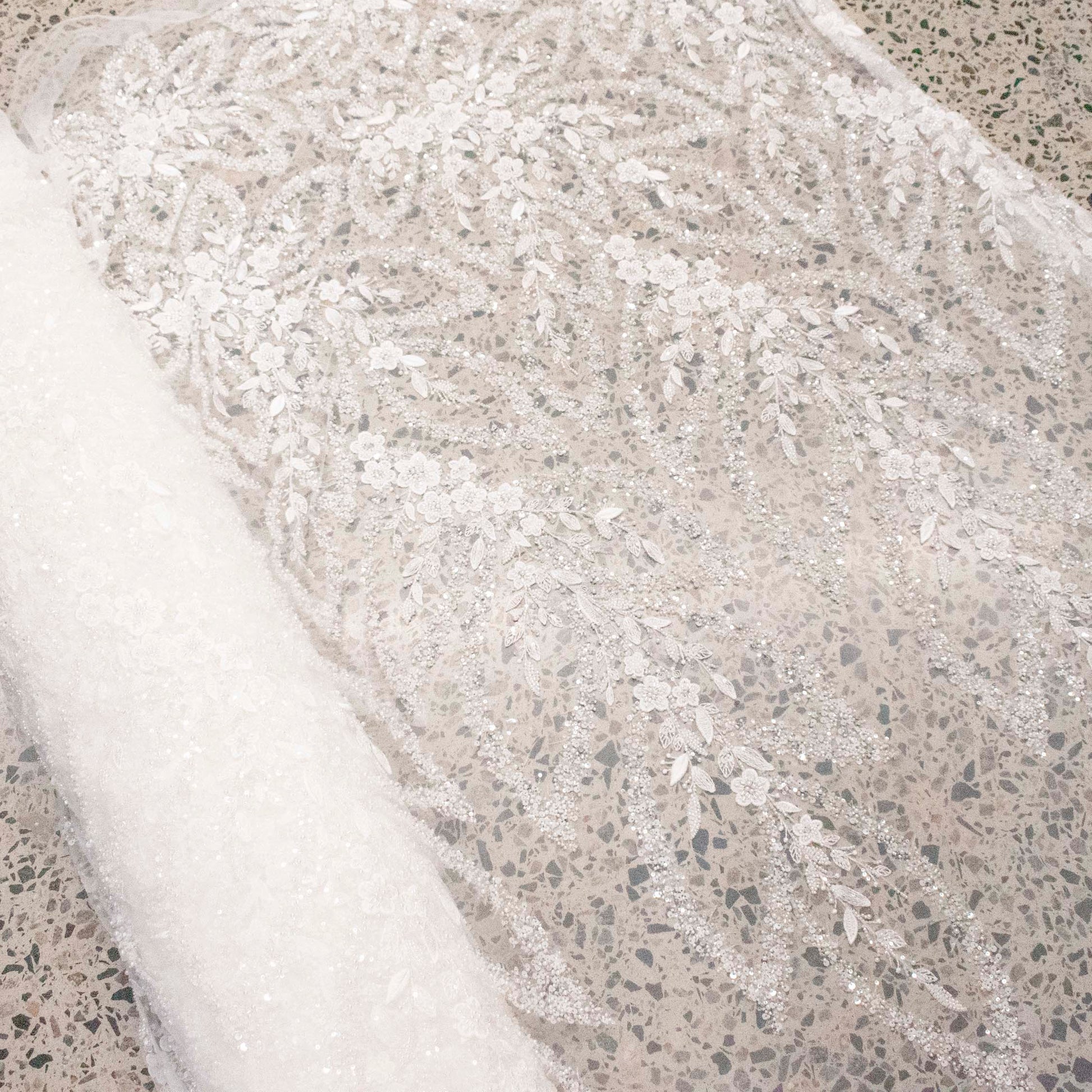 A premium heavyweight embroidered bridal lace designed to elevate any gown into couture territory. Featuring large-scale cascading floral motifs, intricately stitched vines, and a rich scatter of sequins and beads, this fabric radiates luxury and elegance. Ideal for bridalwear, evening gowns, or any couture statement piece, this fabric pairs soft femininity with classic embroidery detail.