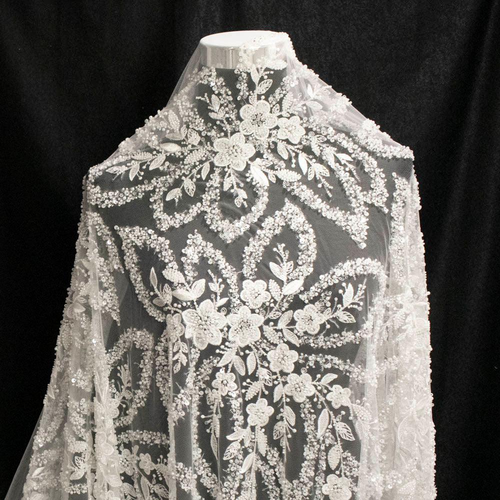 Heavy Beaded 3D Floral Vines Embroidered Couture Bridal Laces – PB2407 White