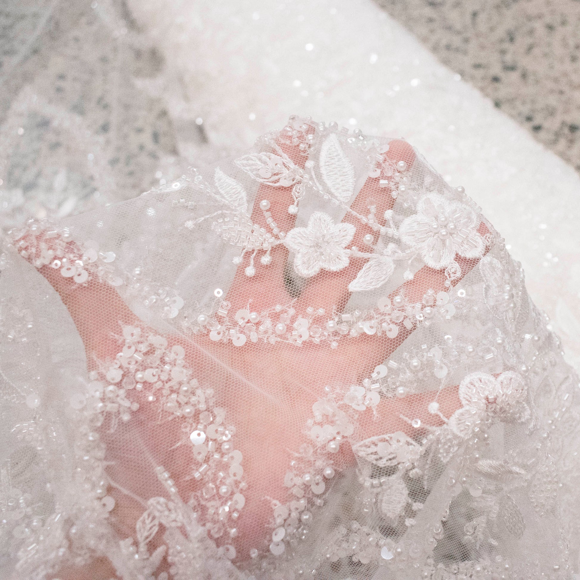 We offer an extensive selection of designs and colourways within this bridal lace category. includes classic whites, soft off-whites, 3D florals, shimmering starlight tulles, sequinned and beaded styles, and options ranging from ultra-lightweight to structured heavyweights. Whether you’re designing a full wedding gown, an evening statement piece, or delicate accessories, we offer something for every silhouette and style.