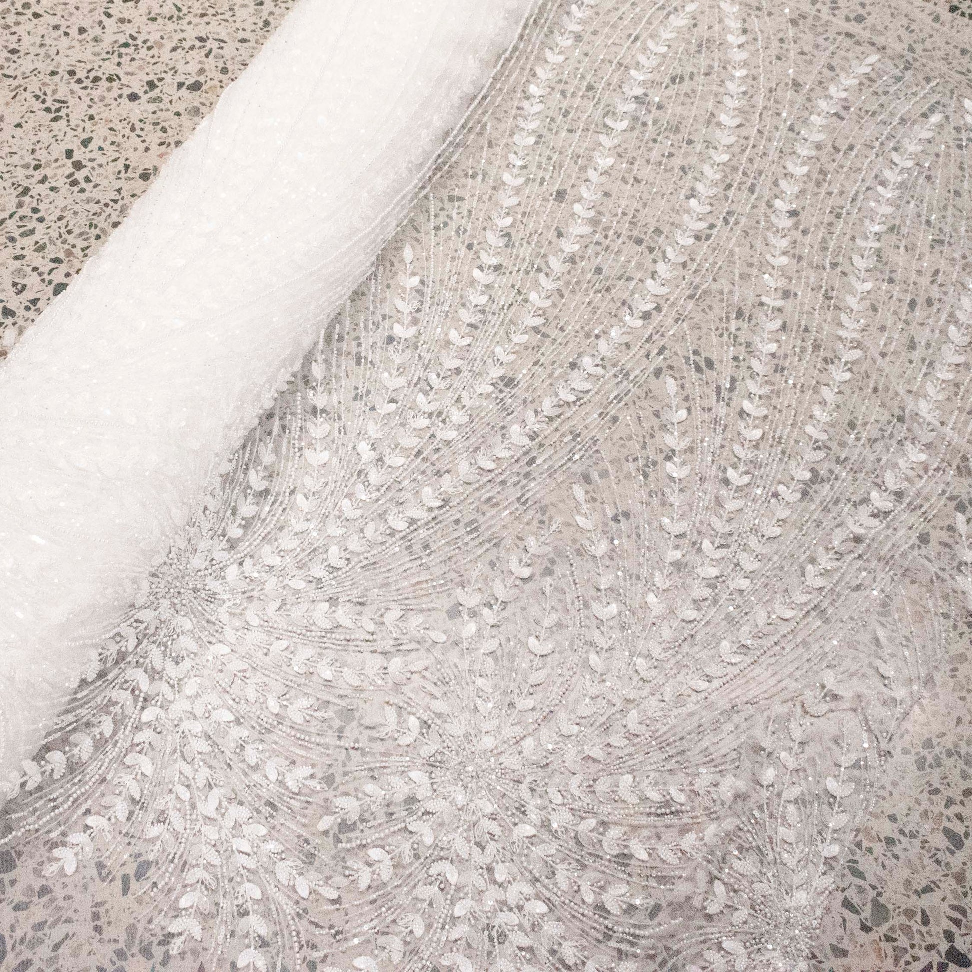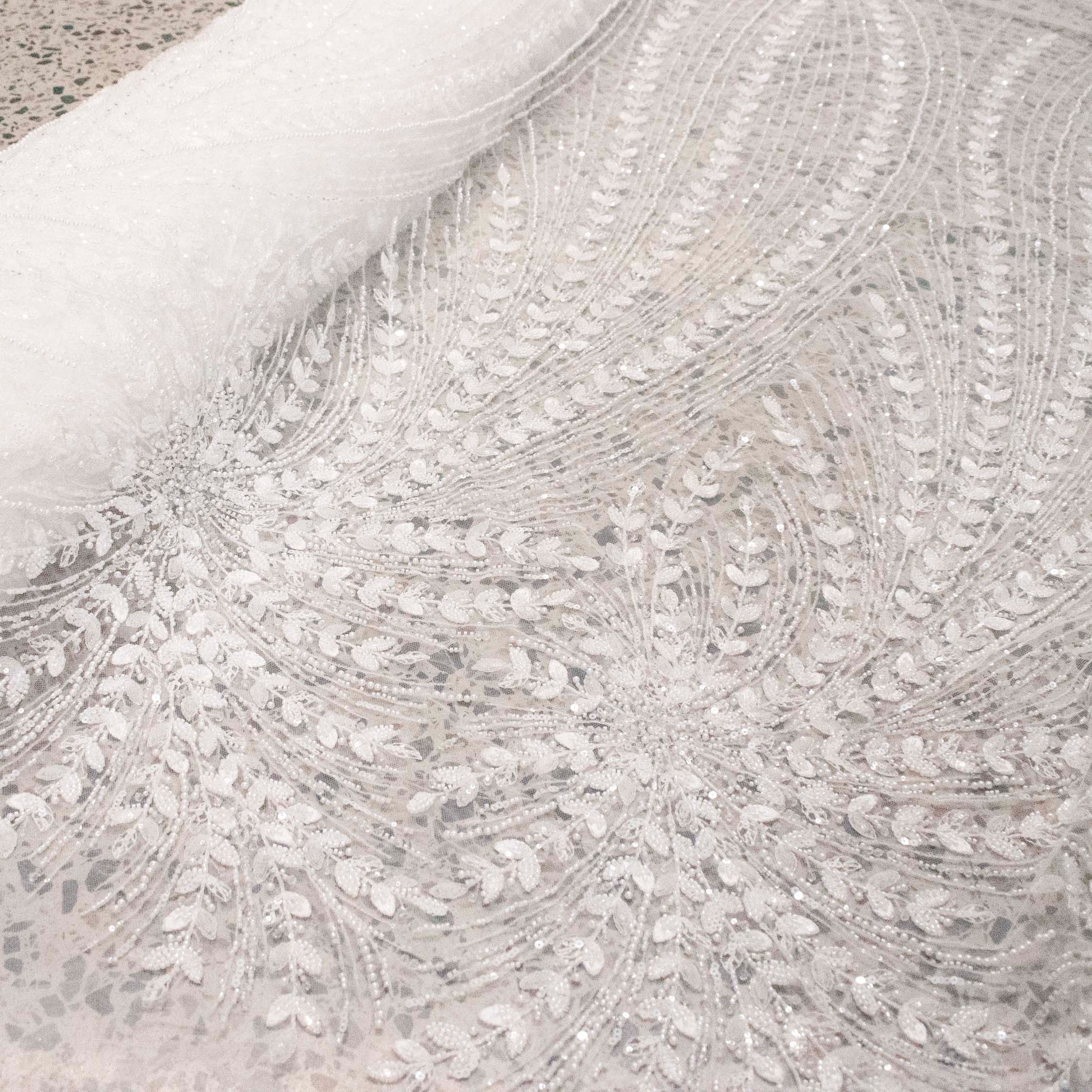 This lace features a stunning starburst pattern that radiates outward from a central point in sweeping, curved lines. Embellished with delicate vines, floral motifs, and cascading tendrils, it’s richly detailed with shimmering sequins and pearl-like beads. Ideal for bridalwear, evening gowns, or any couture statement piece, this fabric pairs soft femininity with classic embroidery detail.