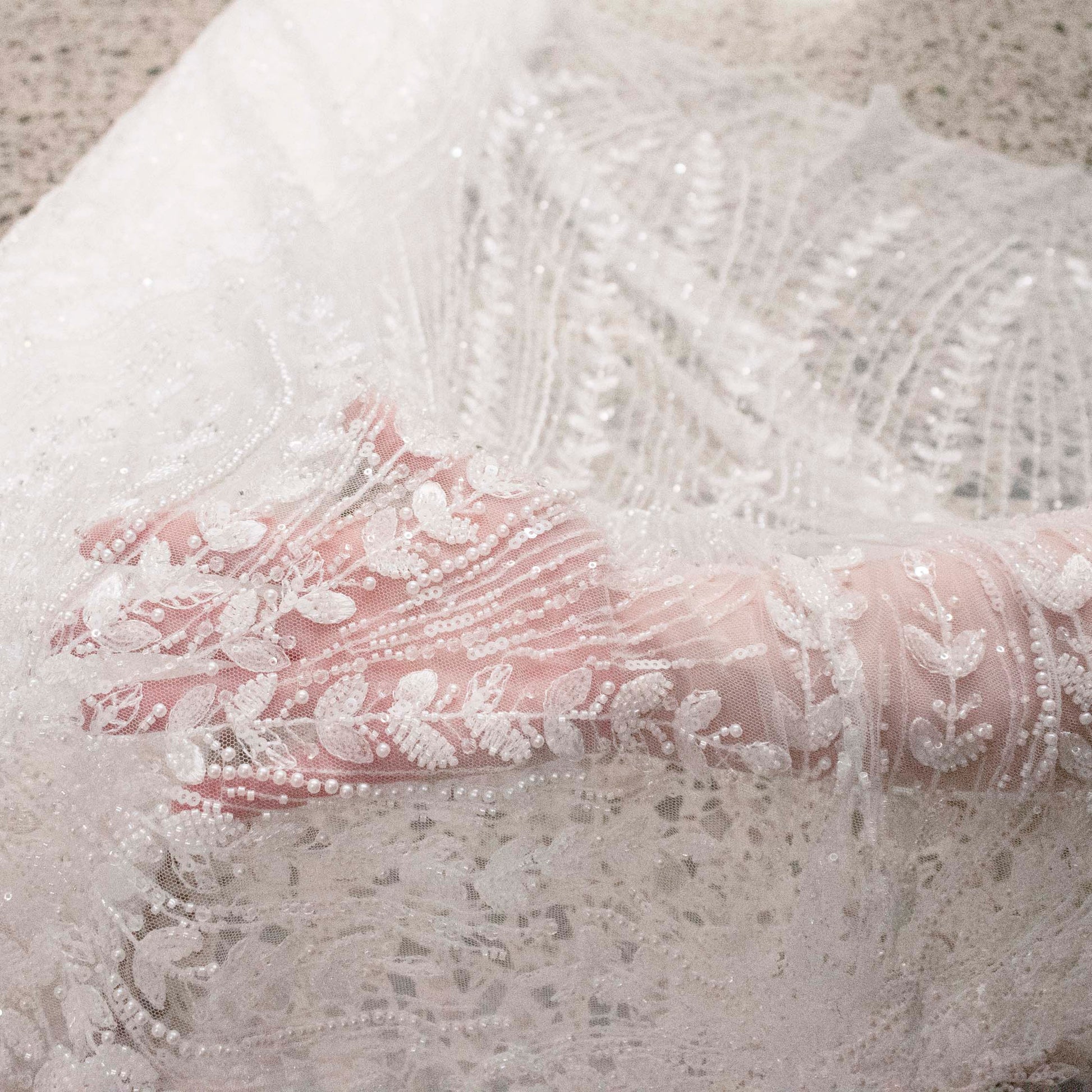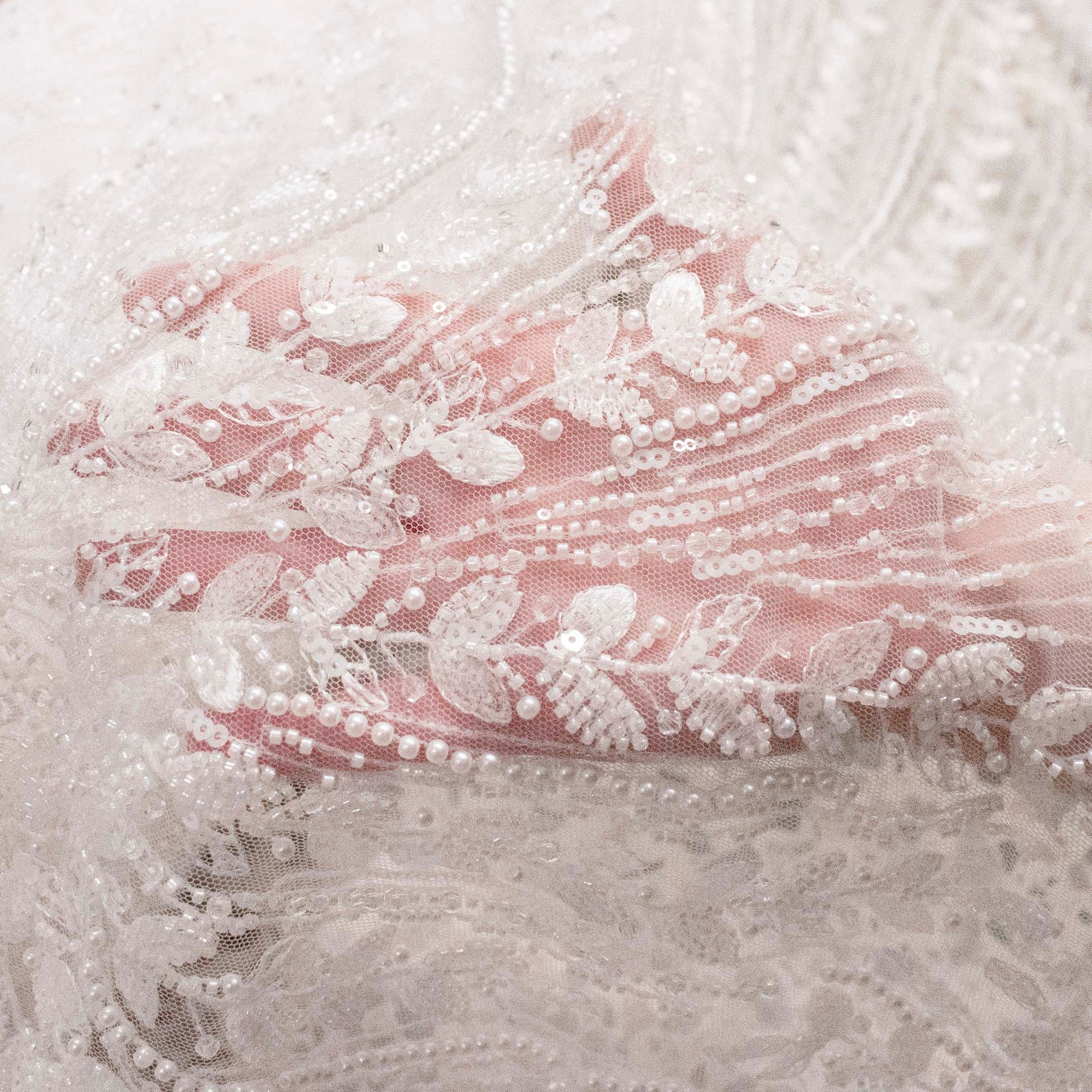 We offer an extensive selection of designs and colourways within this bridal lace category. includes classic whites, soft off-whites, 3D florals, shimmering starlight tulles, sequinned and beaded styles, and options ranging from ultra-lightweight to structured heavyweights. Whether you’re designing a full wedding gown, an evening statement piece, or delicate accessories, we offer something for every silhouette and style.
