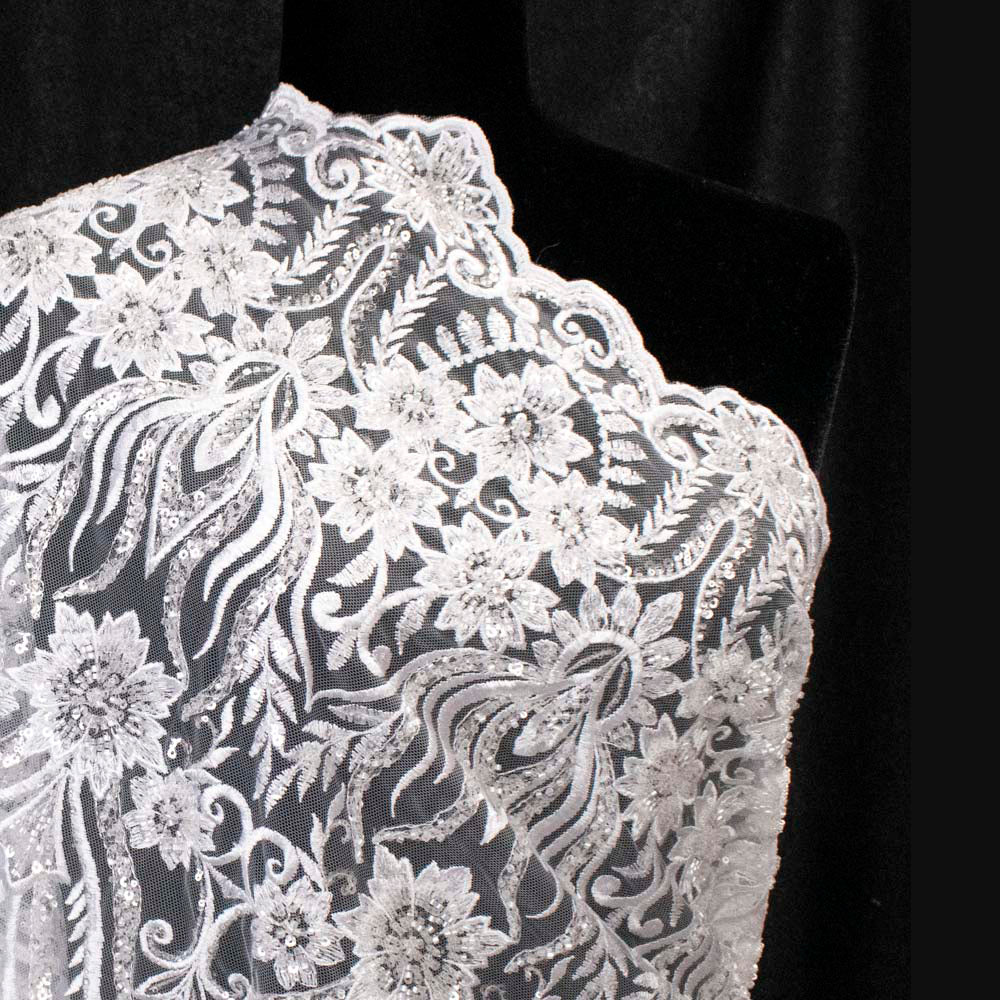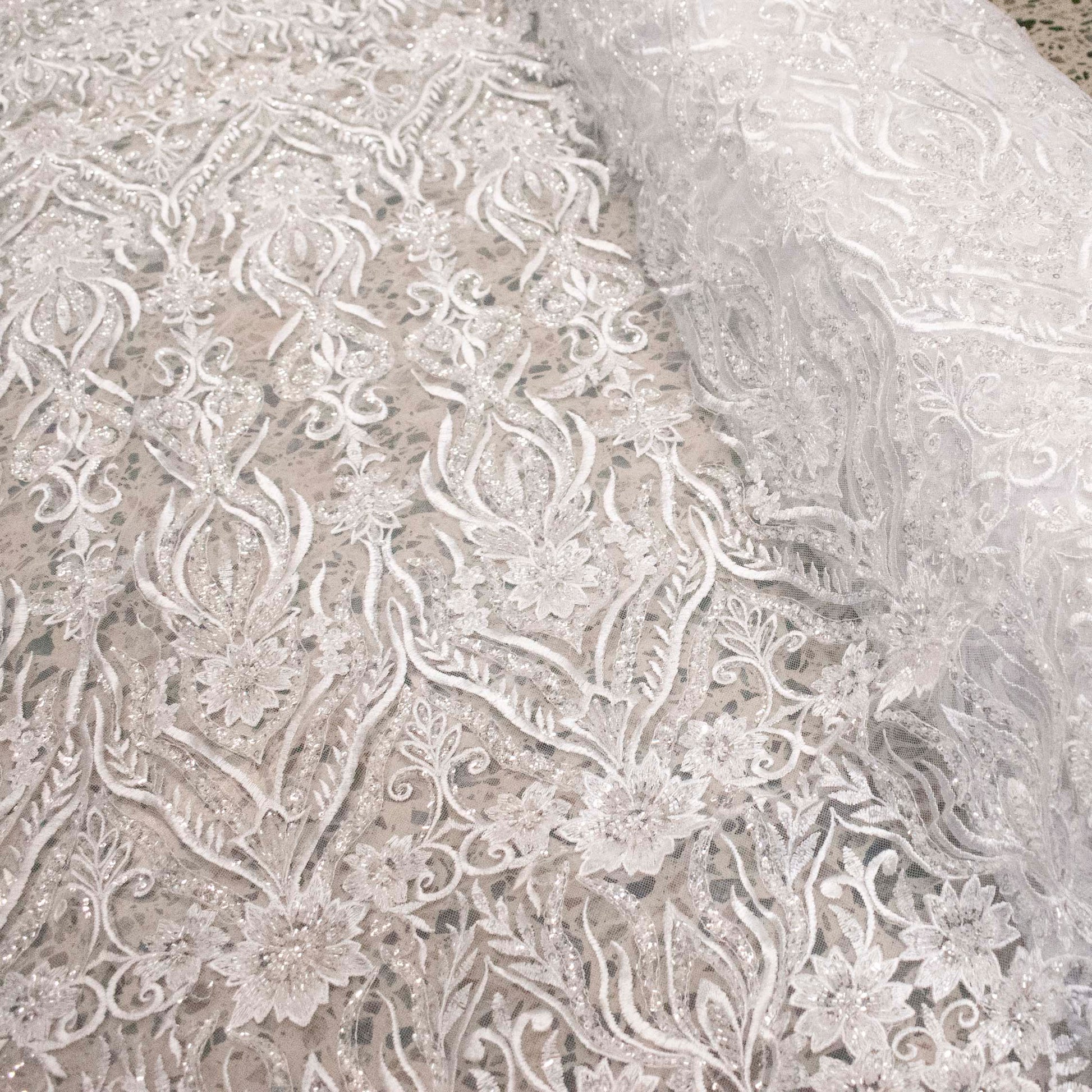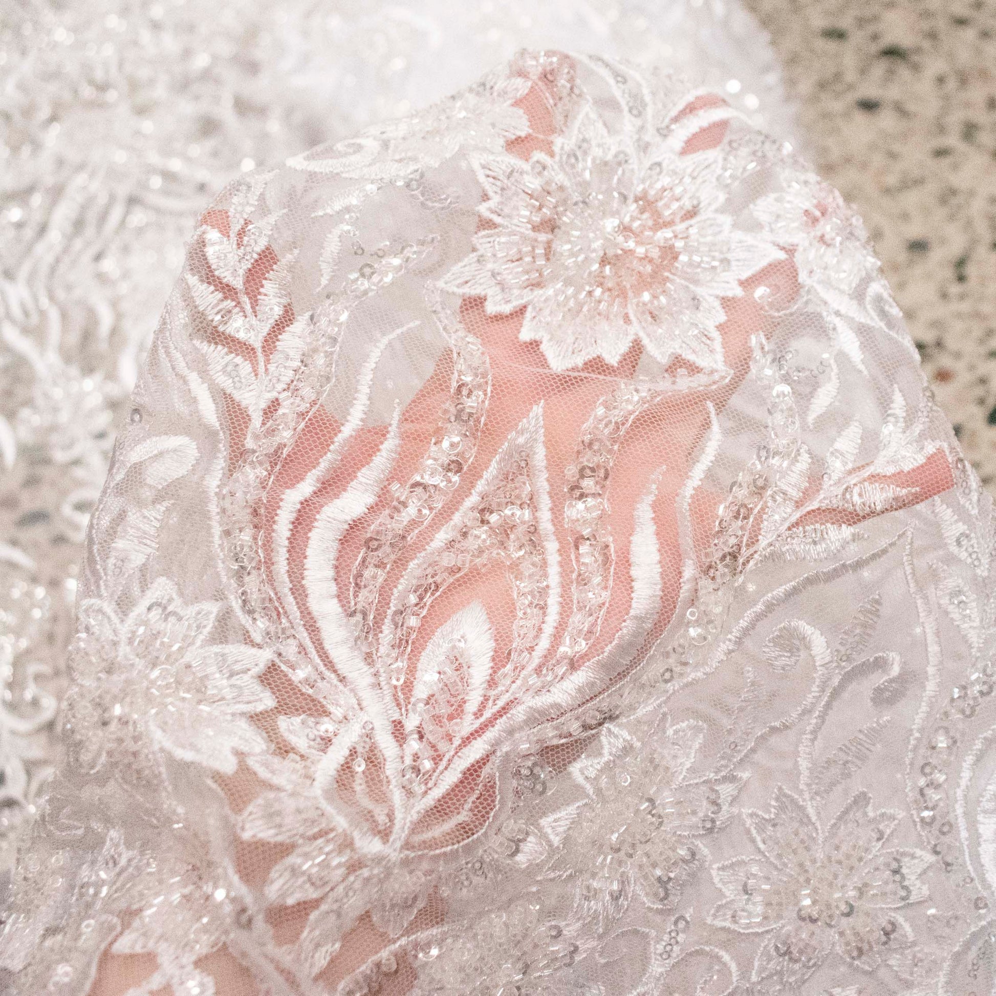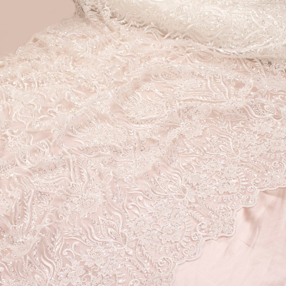 We offer an extensive selection of designs and colourways within this couture lace category. From minimalist floral accents to fully encrusted 3D appliqué versions, the variety caters to every aesthetic – whether you're designing something modern and understated, or something bold and theatrical. Many of our laces are embellished with pearls, sequins, feathers, or corded embroidery for additional texture and dimension.