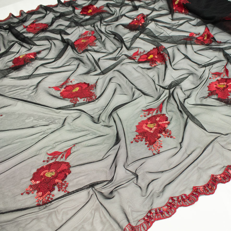 An embroidered sequin on a soft tulle mesh open background. Reminiscent of the opulent colors and intricate patterns of the orient this sequenced lace would be a perfect choice for dance costumes and cocktail wear. The tulle mesh background enables the lace to give a soft, floaty drape to your garment.