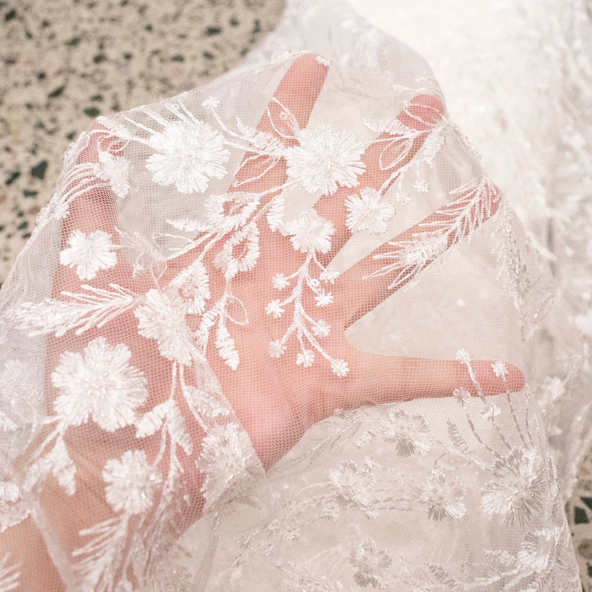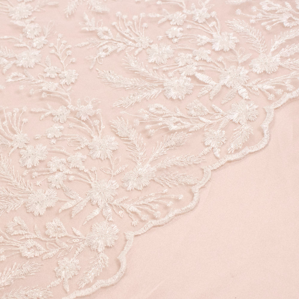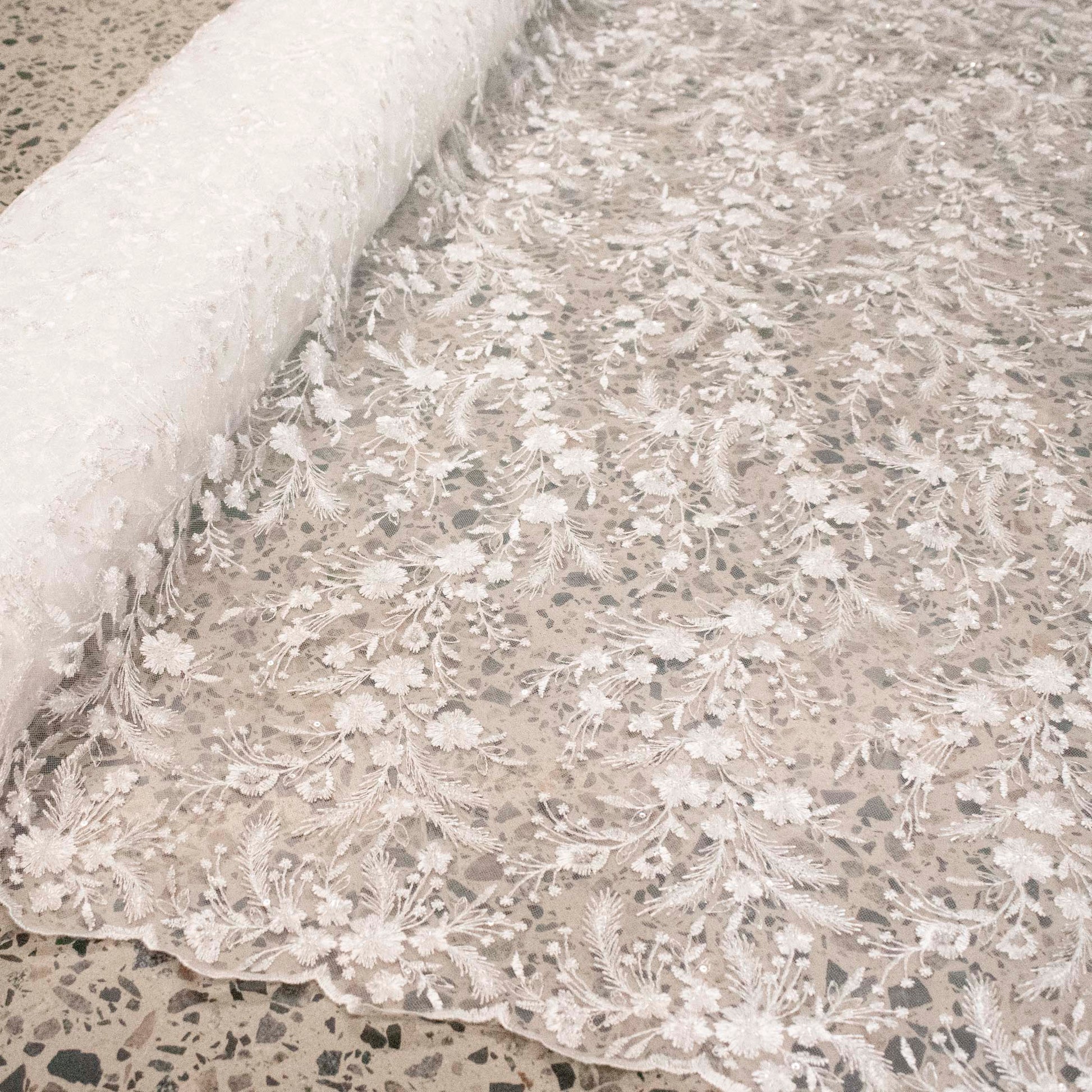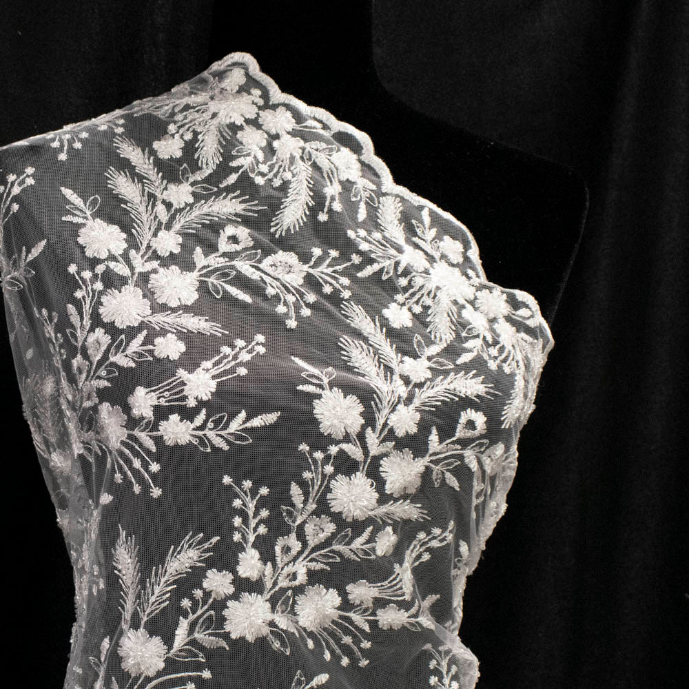 Designed on a sheer mesh base, this lace showcases clusters of wildflower-style blossoms, delicate foliage, and airy botanical sprays. Finished with a gently scalloped edge, it adds graceful flow to dresses, overlays, and veils. Ideal for bridalwear, evening gowns, or any couture statement piece, this fabric pairs soft femininity with classic embroidery detail.