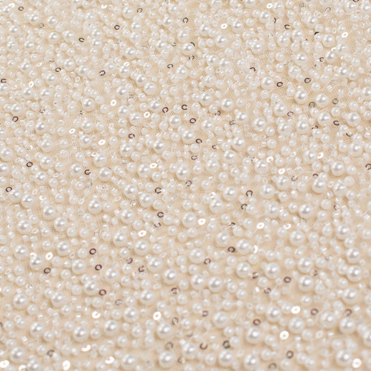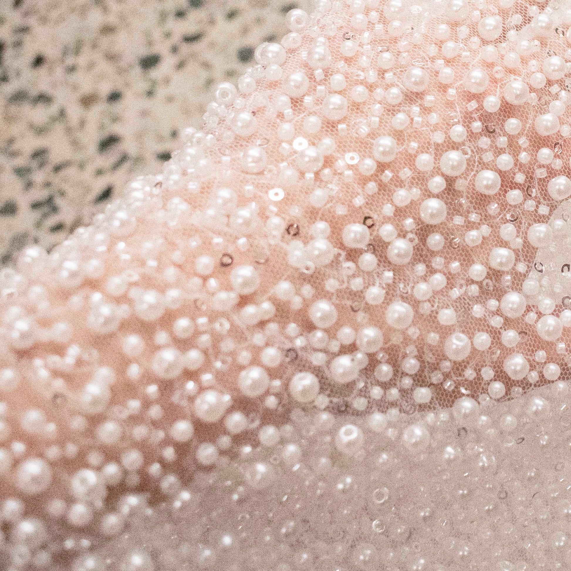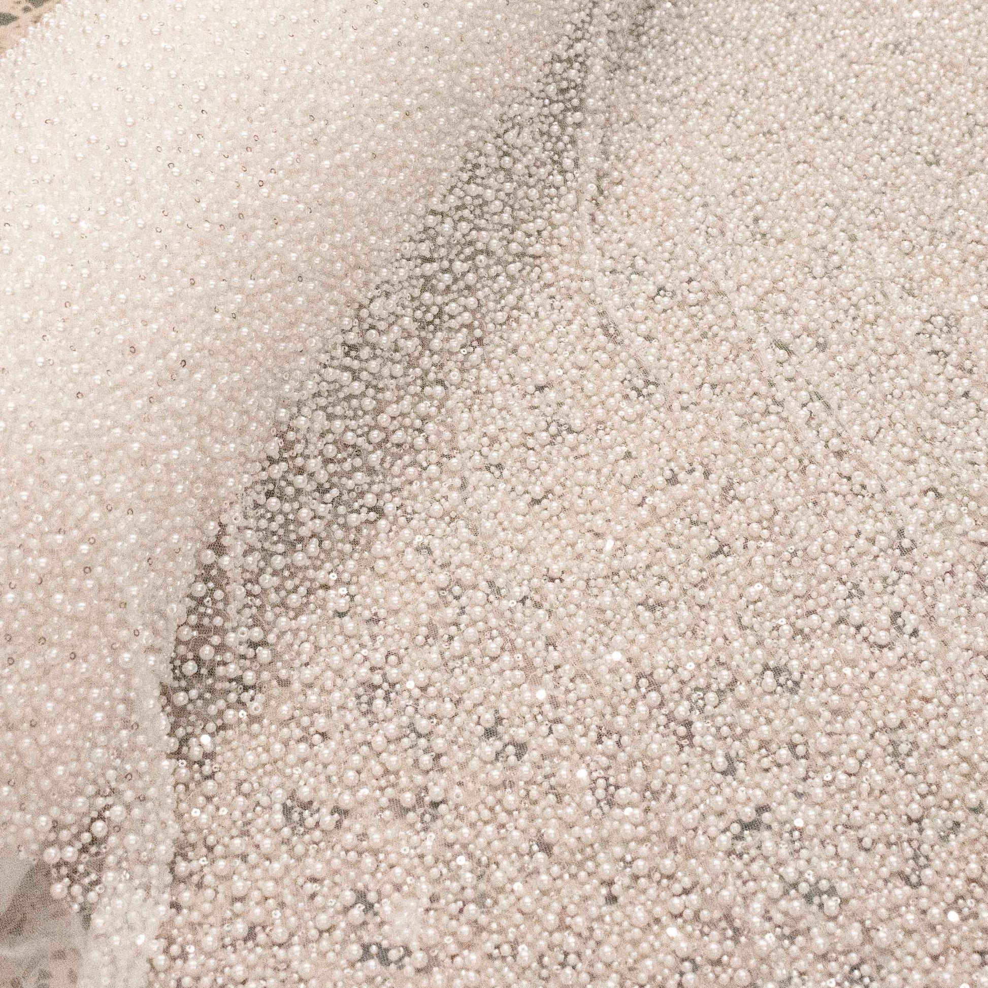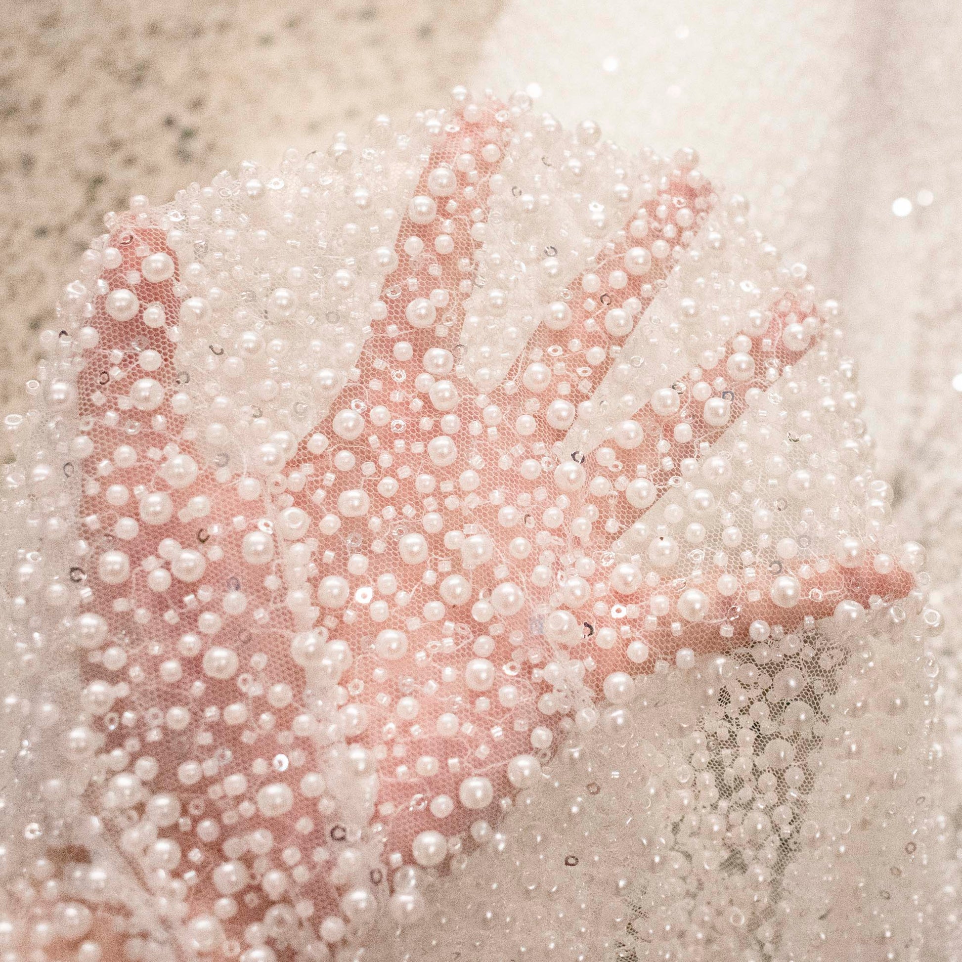 Experience the ultimate elegance with our Luxury Pearl & Crystal Beaded Sequins Mesh Lace, a fabric designed for bridal couture, eveningwear, and high-fashion creations. Featuring intricate machine-applied pearls, shimmering crystals, and sequins, this exquisite fabric adds a touch of glamour and sophistication to any design.