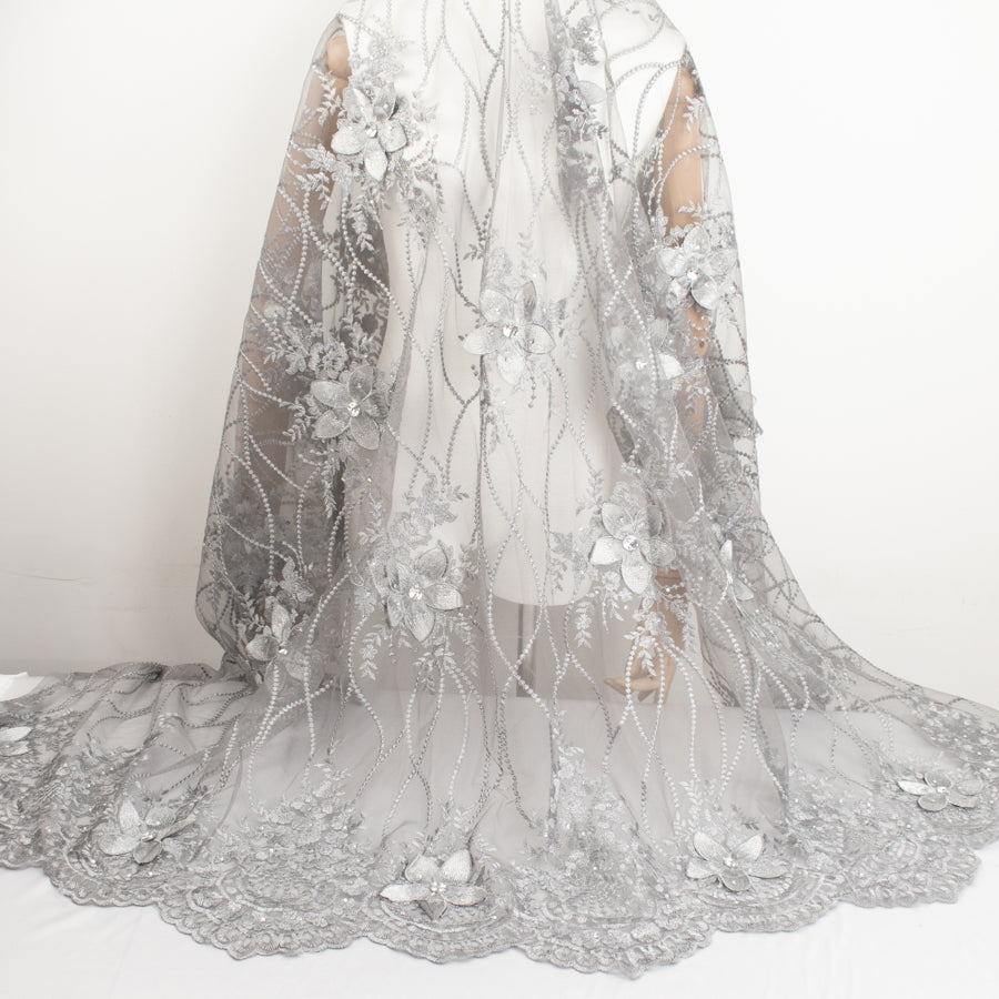 3D Flower with Gemstone Jewel Lace Design-4 Light Silver