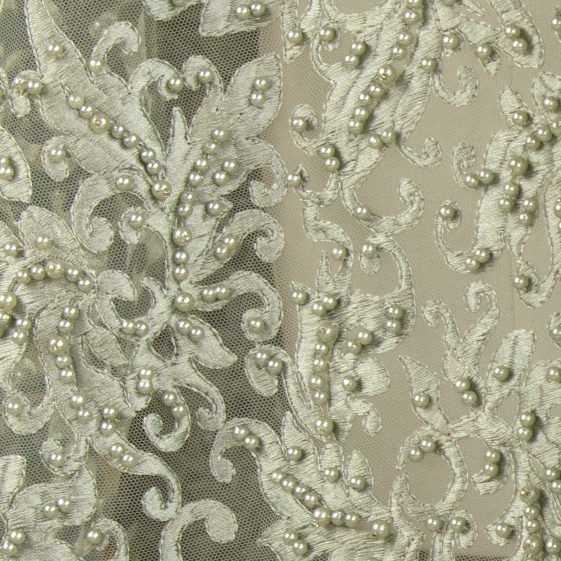 Content: 80% Nylon, 20% PolyesterWidth: 59”/150cm A soft, fine textured tulle netting with tiny pearls attached for...