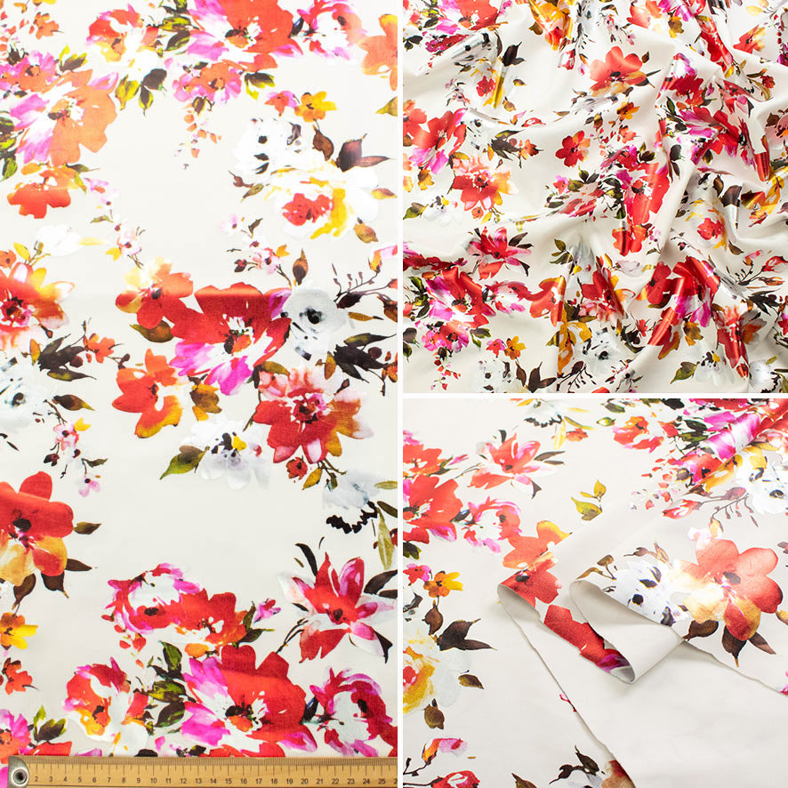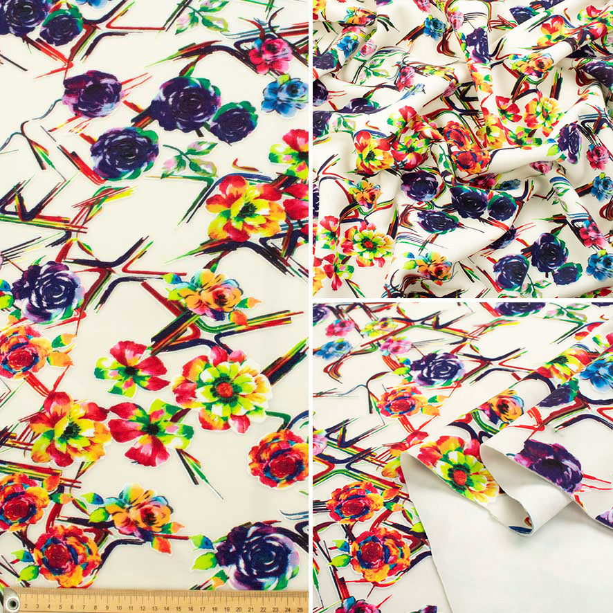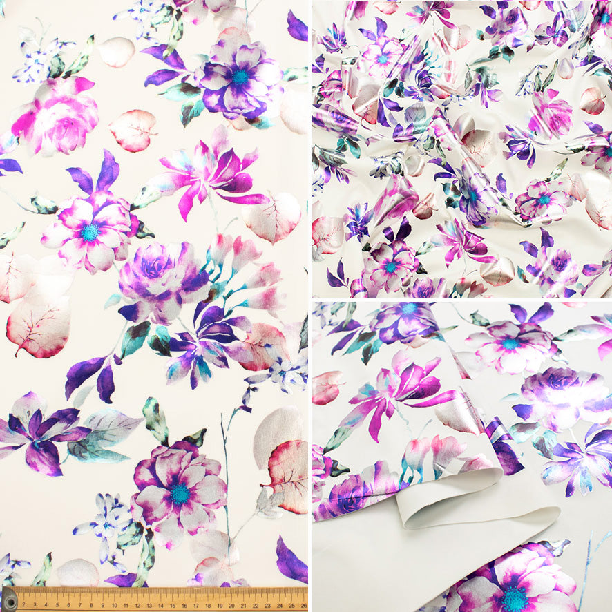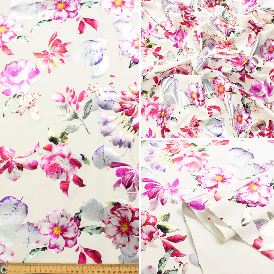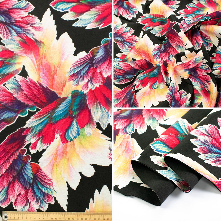 Our Neoprene (Scuba) Digital Prints feature stunningly vibrant 3D designs, including beautiful flowers and peacock prints. Some designs are enhanced with lurex yarn, adding a subtle shimmer and depth to the fabric. This scuba material has a soft, smooth texture with excellent stretch and recovery, making it perfect for fitted garments like dresses, skirts, and jackets. Also available in plain colors, this fabric combines comfort, structure, and standout style, ideal for creating bold and unique fashion pieces.