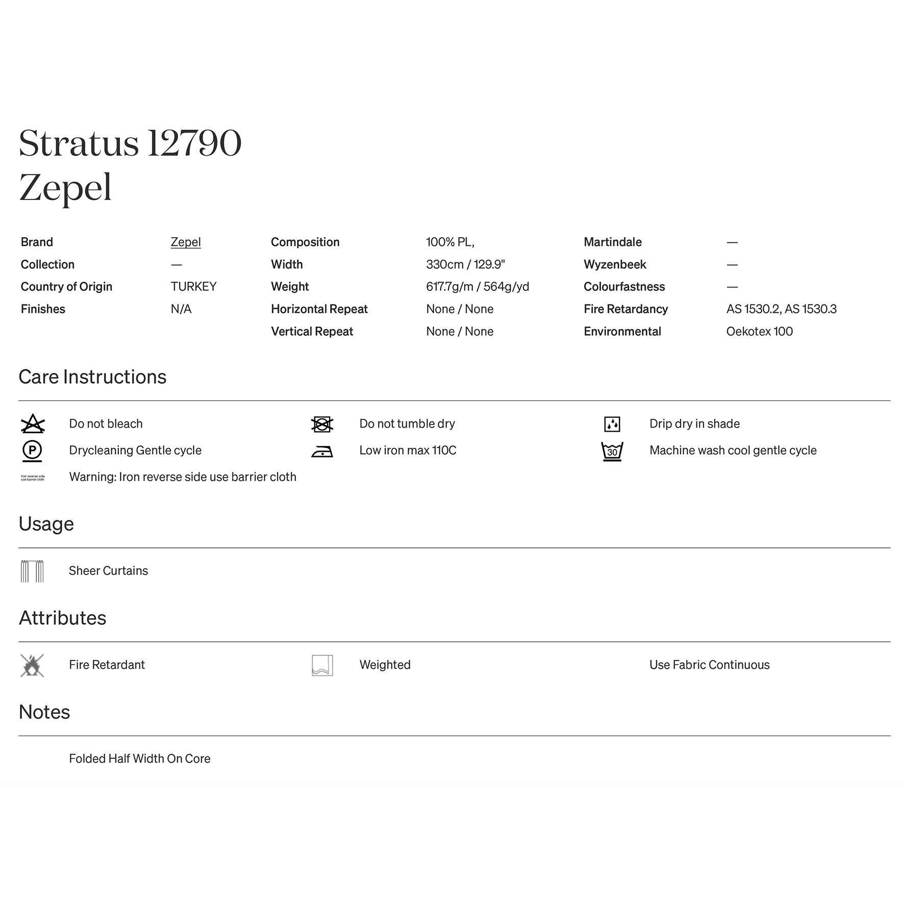Attributes: Fire Retardant, Weighted, Use Fabric Continuous