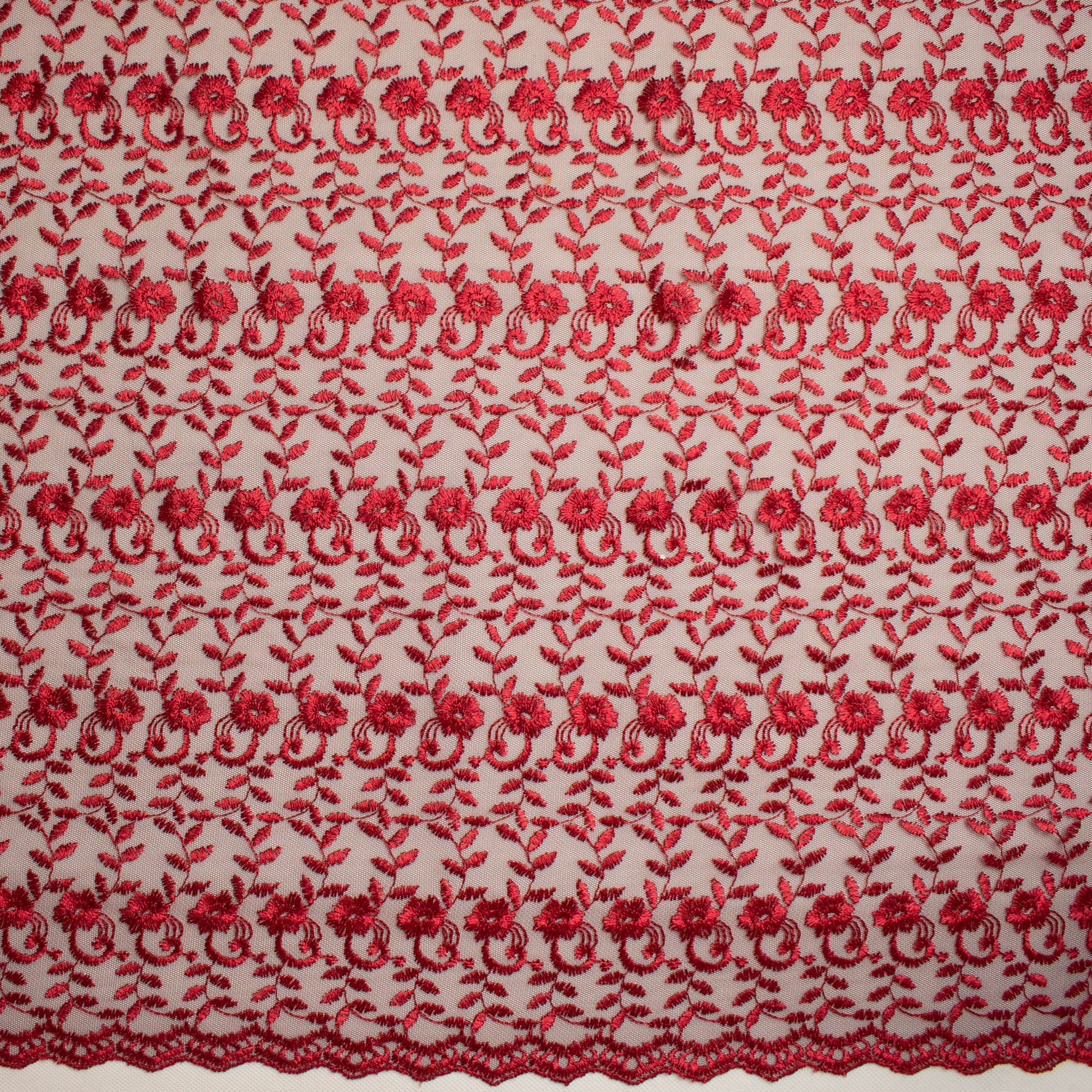 A densely Embroidered Lace on a tulle net backing with double scalloped edges. The embroidery comes in two sizes - A larger floral design and a smaller all over floral pattern. With over fifty colours to choose from, Our Embroidered Lace is the perfect choice for bridal wear, cocktail wear, evening wear as well as mother of the bride. Use a matching or contrasting colour from any of our beautiful Crepe Back Satins as an underlining to finish your garment.