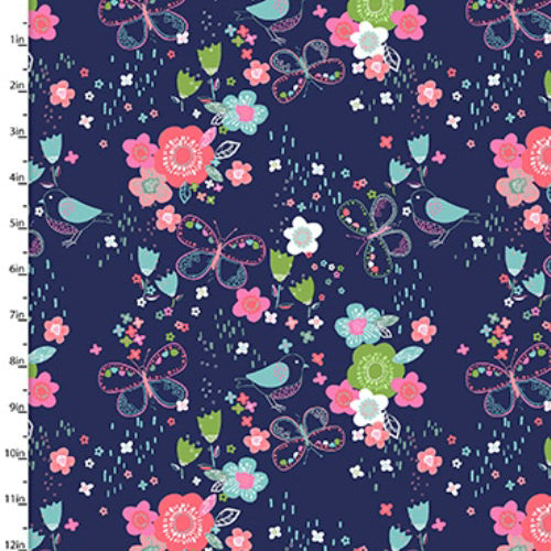 Fabric Editions Hello Spring Garden Navy Garden With Butterfly Flower and Birds Cotton Prints
