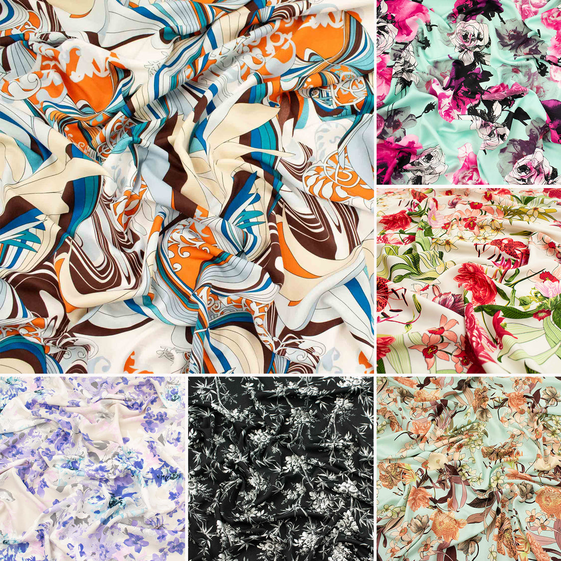 Content: 100% PolyesterWidth: 112CMWeight: 110GSM A beautiful selection of 112cm wide printed crepe in assorted florals, abstracts and geometrics –...