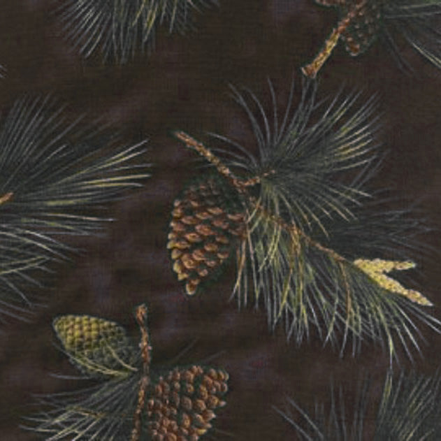 Kona Bay Fabrics Outdoor Green Pine Leaf & Cone on Black Cotton Prints