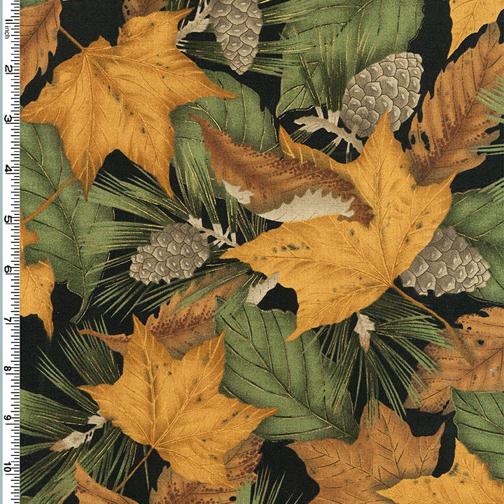 Kona Bay Fabrics Outdoor Gold Pine Cone & Leaf on Black Cotton Prints