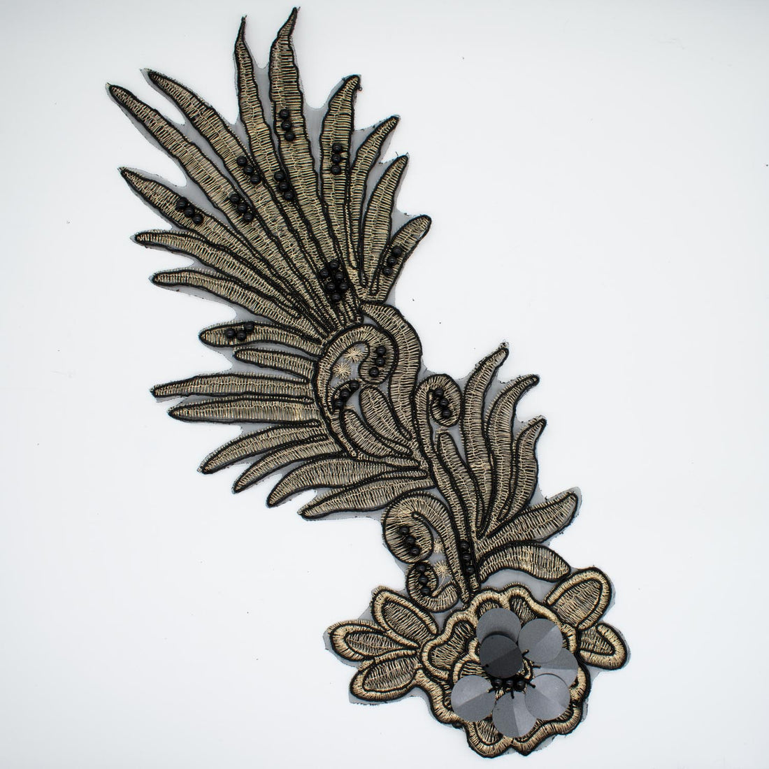 3D Flower Sequin & Pearl Embroidered Gold & Black Applique Motif Design-MOT-O