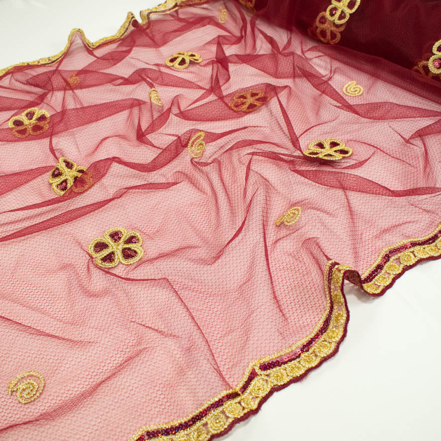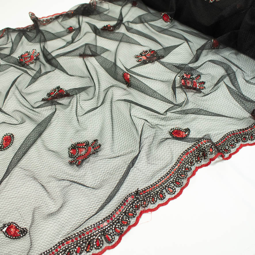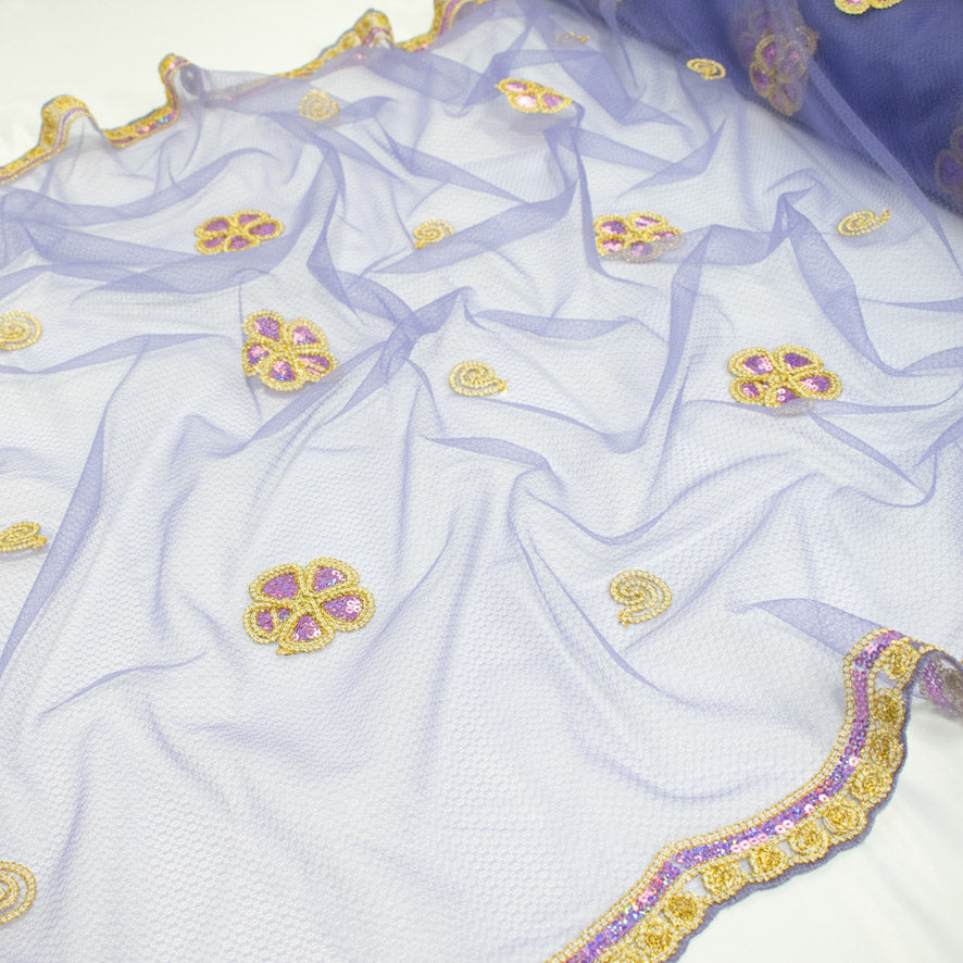 A knitted embroidered lace with extensive outline cording on a soft spider mesh open background. Reminiscent of the opulent colors and intricate patterns of the Orient this corded sequenced lace would be a perfect choice for dance costumes and cocktail wear. The spider mesh background gives the lace a soft, floaty drape to your garment.