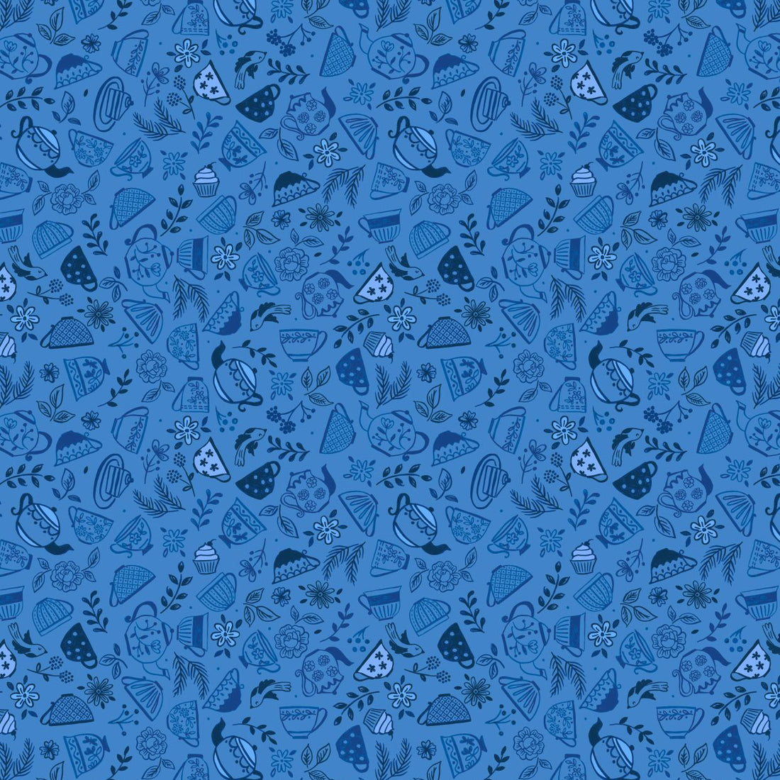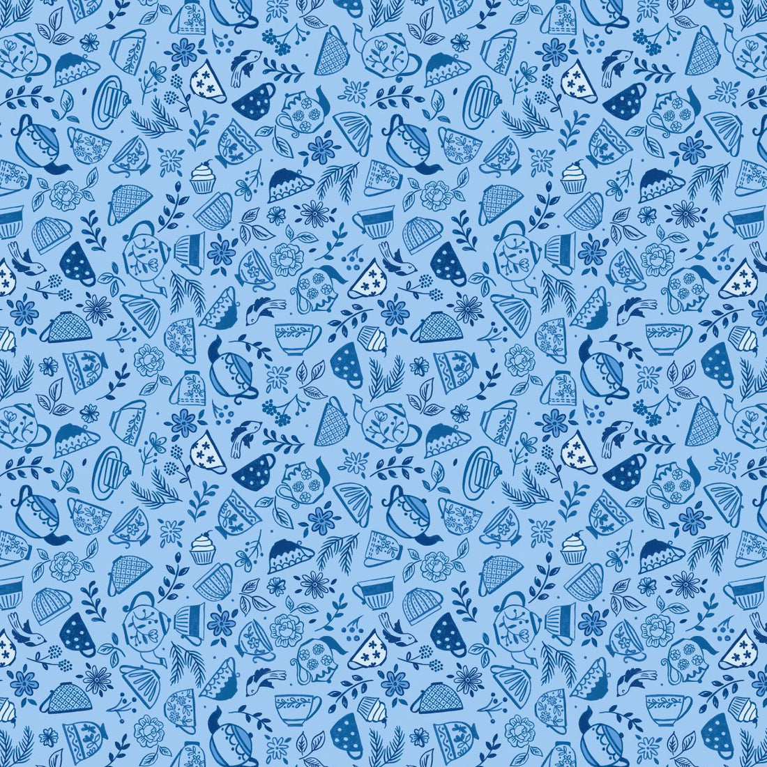 Lewis & Irene Teatime Teapots & Teacups on Blue Cotton Prints