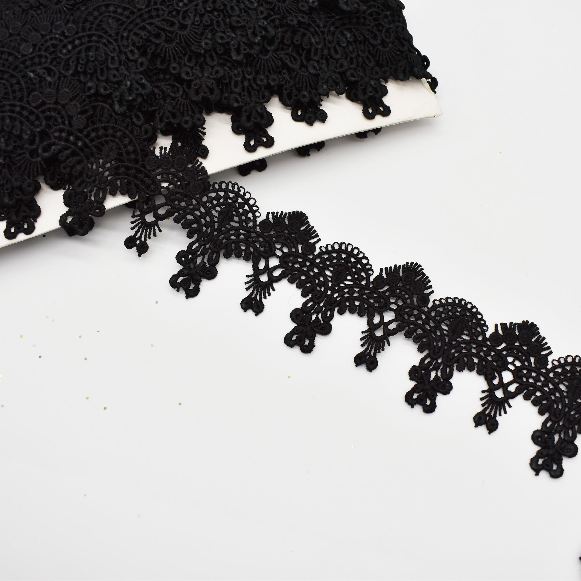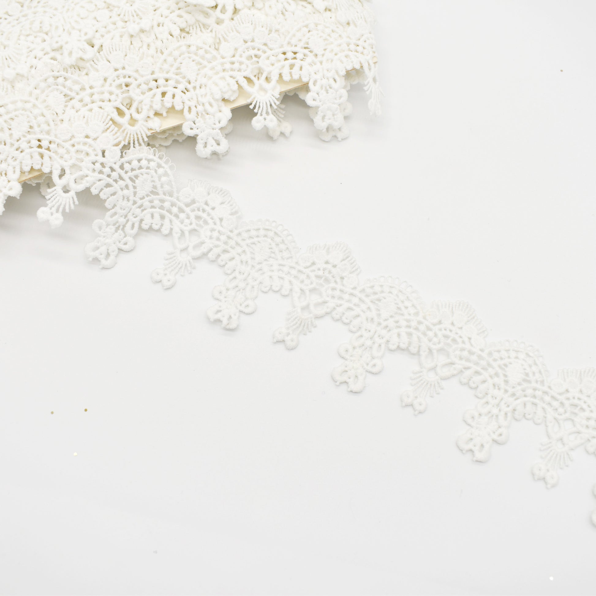 A dainty guipure lace with a decorative edging to trim your sewing projects, such as shawls, dresses and blouses.