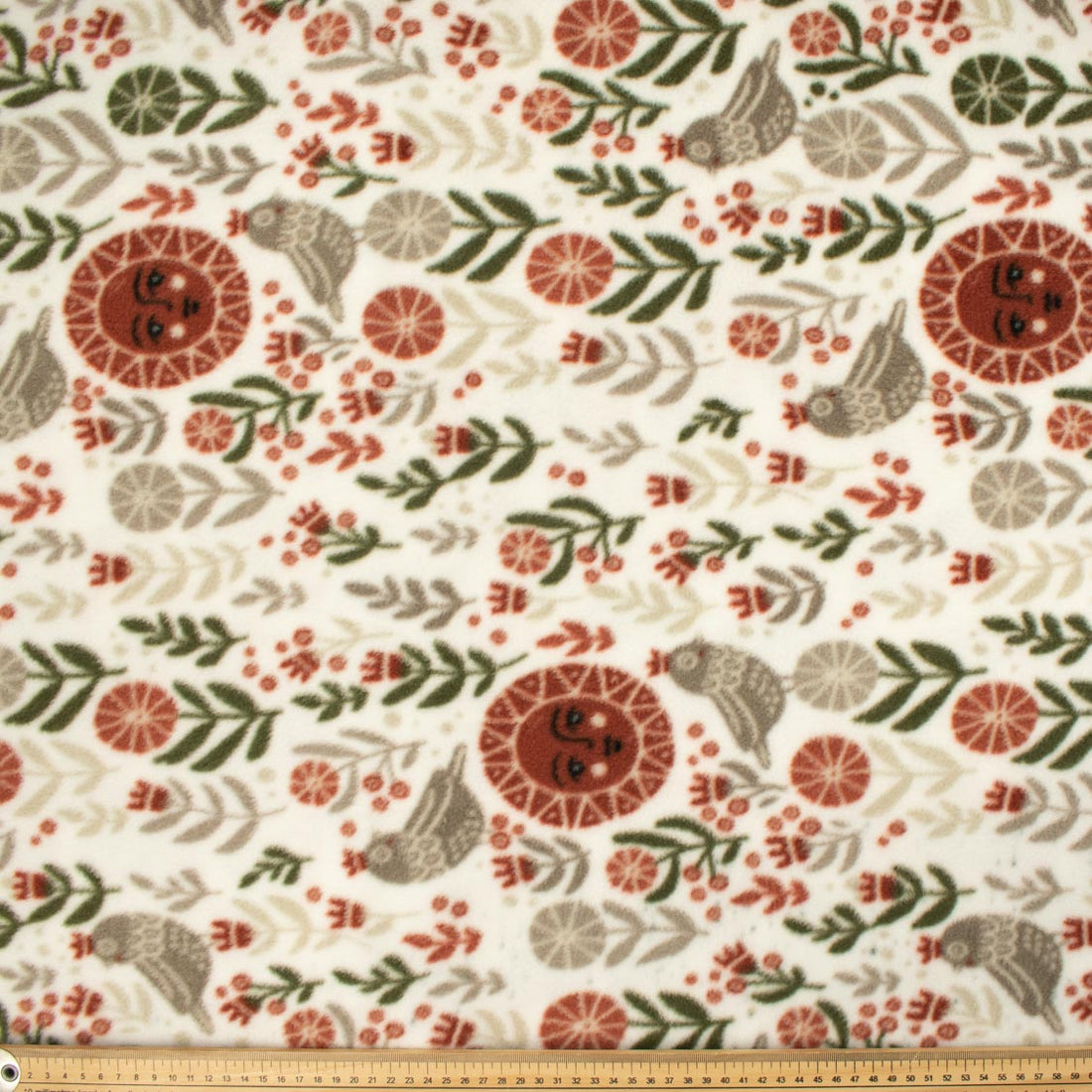 Maroon Sun, Flowers & Grey Birds on White Printed Polar Fleece DSN #14