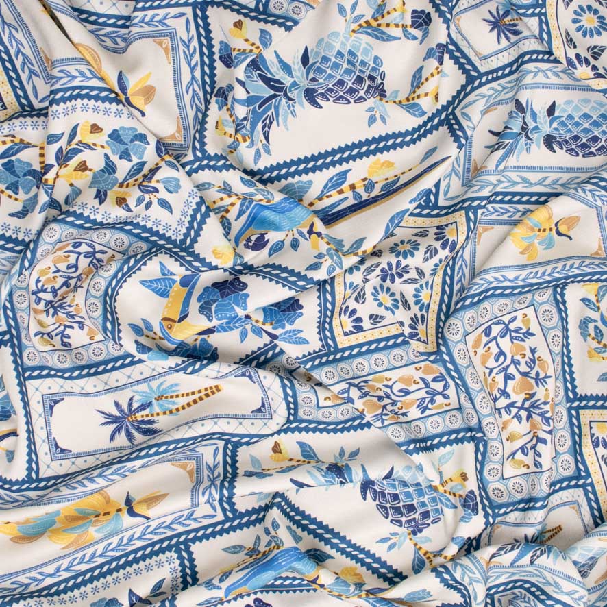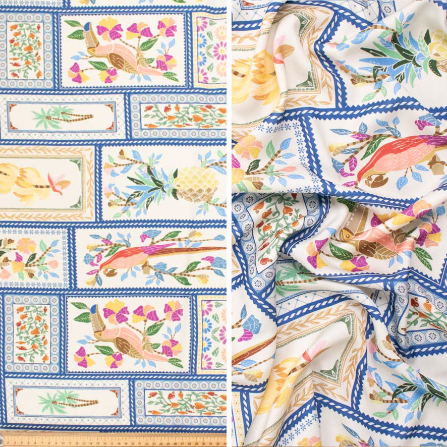 Pearl Silk Crush Digital Prints Design 5 Blue Fruit and Bird Frame Mosaic