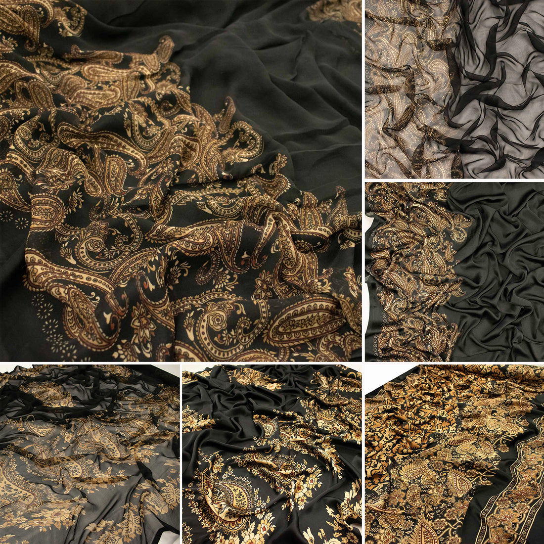 Content: 100% PolyesterWeight: 140GSM (Satin), 70GSM (Chiffon)Width: 150CM Our Paisley Border Prints feature elegant gold and...