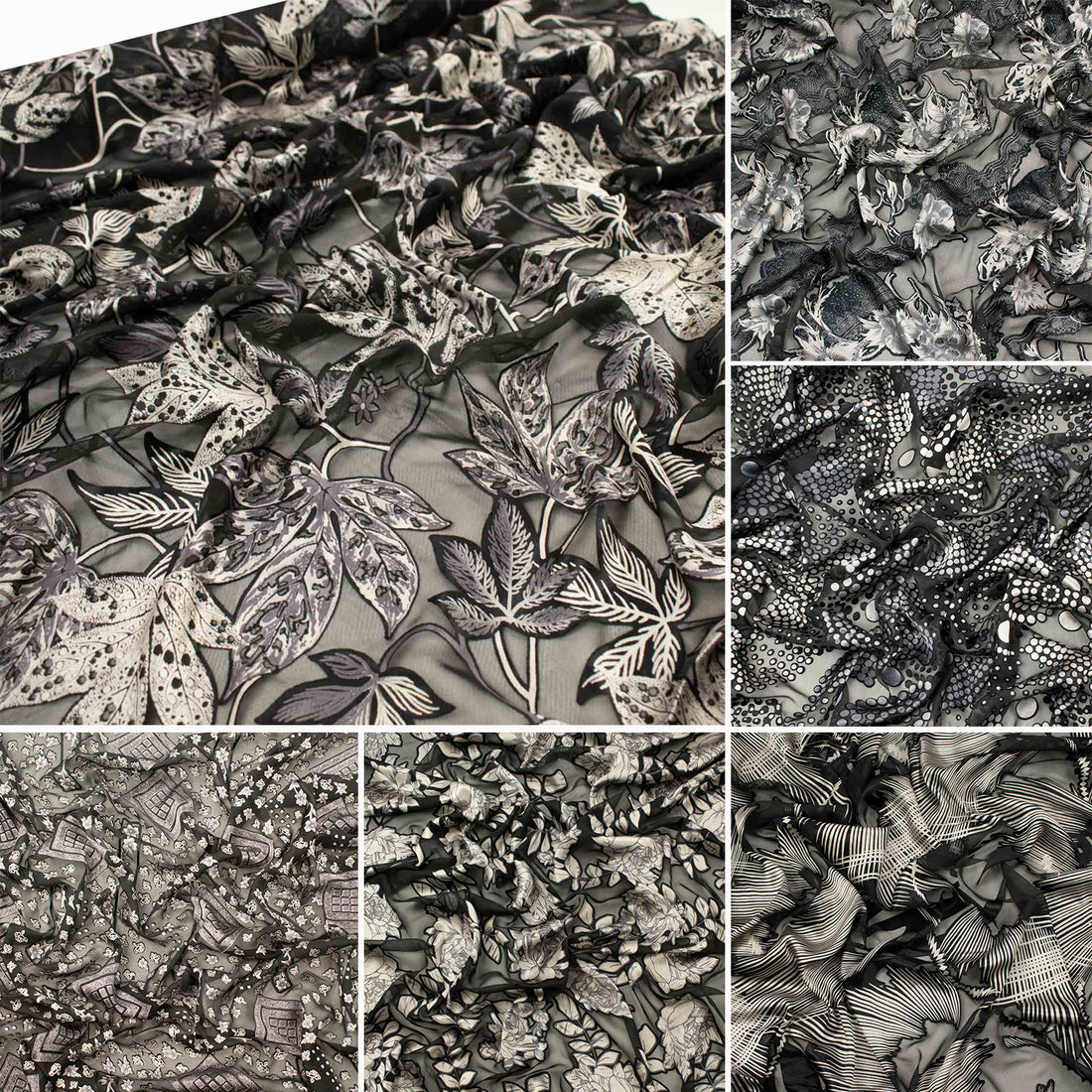 Composition: 100% PolyesterWidth: 130cmWeight: 90GSM Our luxurious Burnout Chiffon features a striking contrast of silver on...