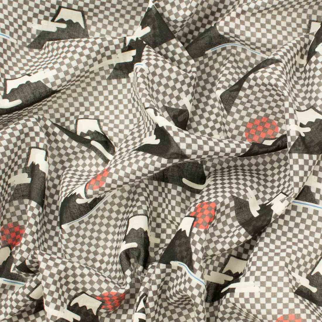 Printed Cotton Voile Design-86 Fuji Mountain on Black & Grey Checks