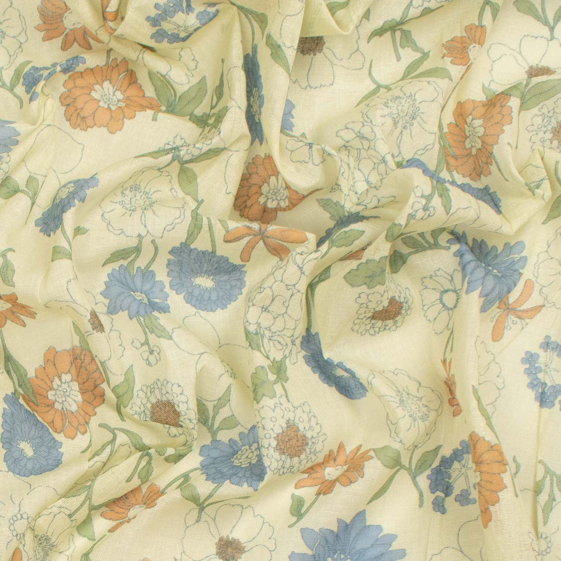 Printed Cotton Voile Design-65 Blue & Orange Florals on Light Yellow