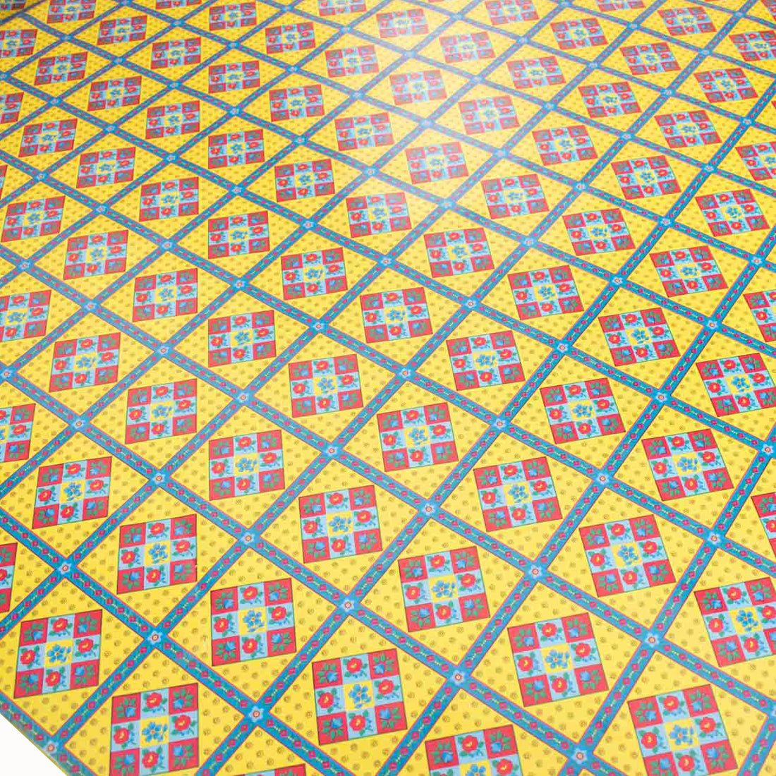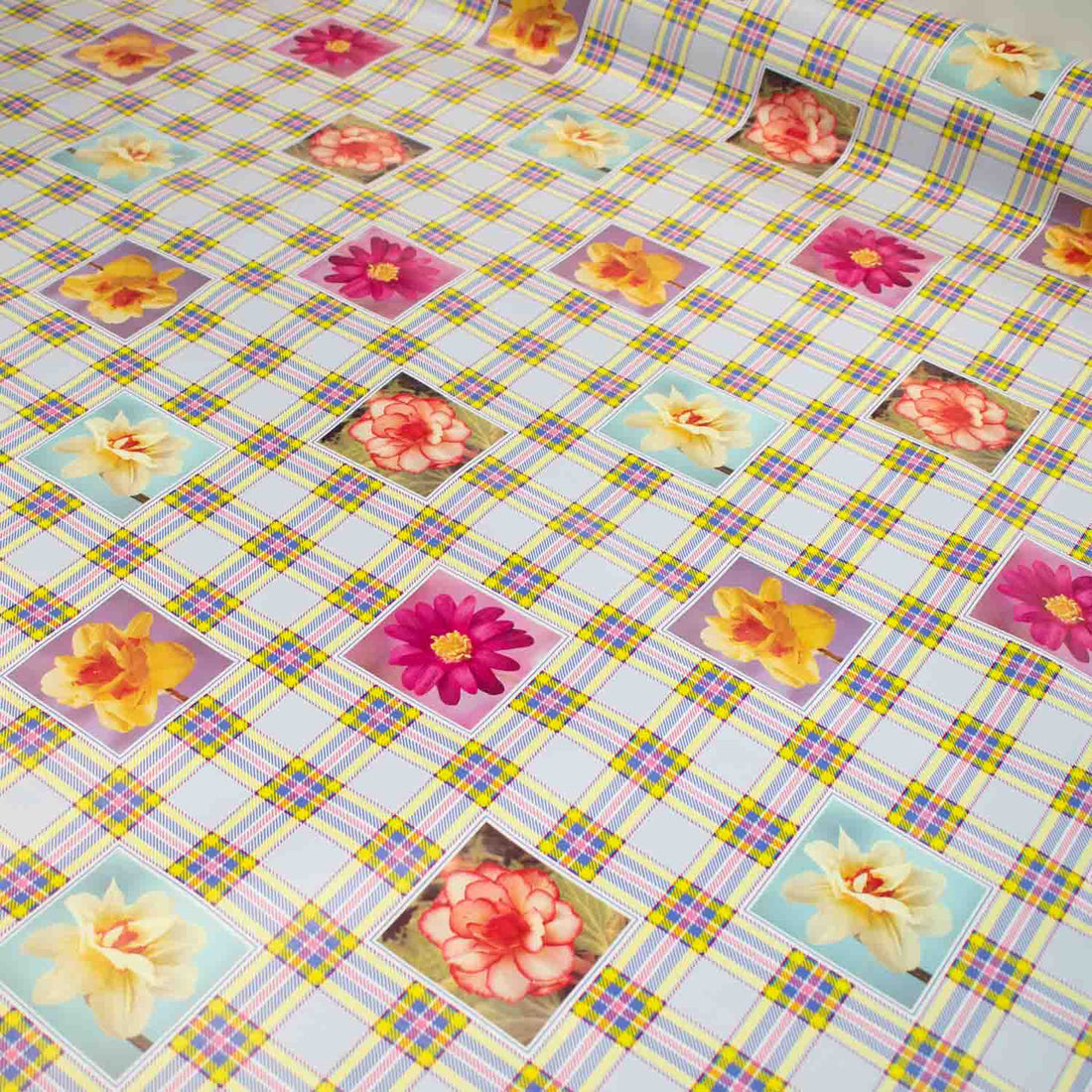 Flowers & Checks on Blue Plastic Tablecloth Fabric