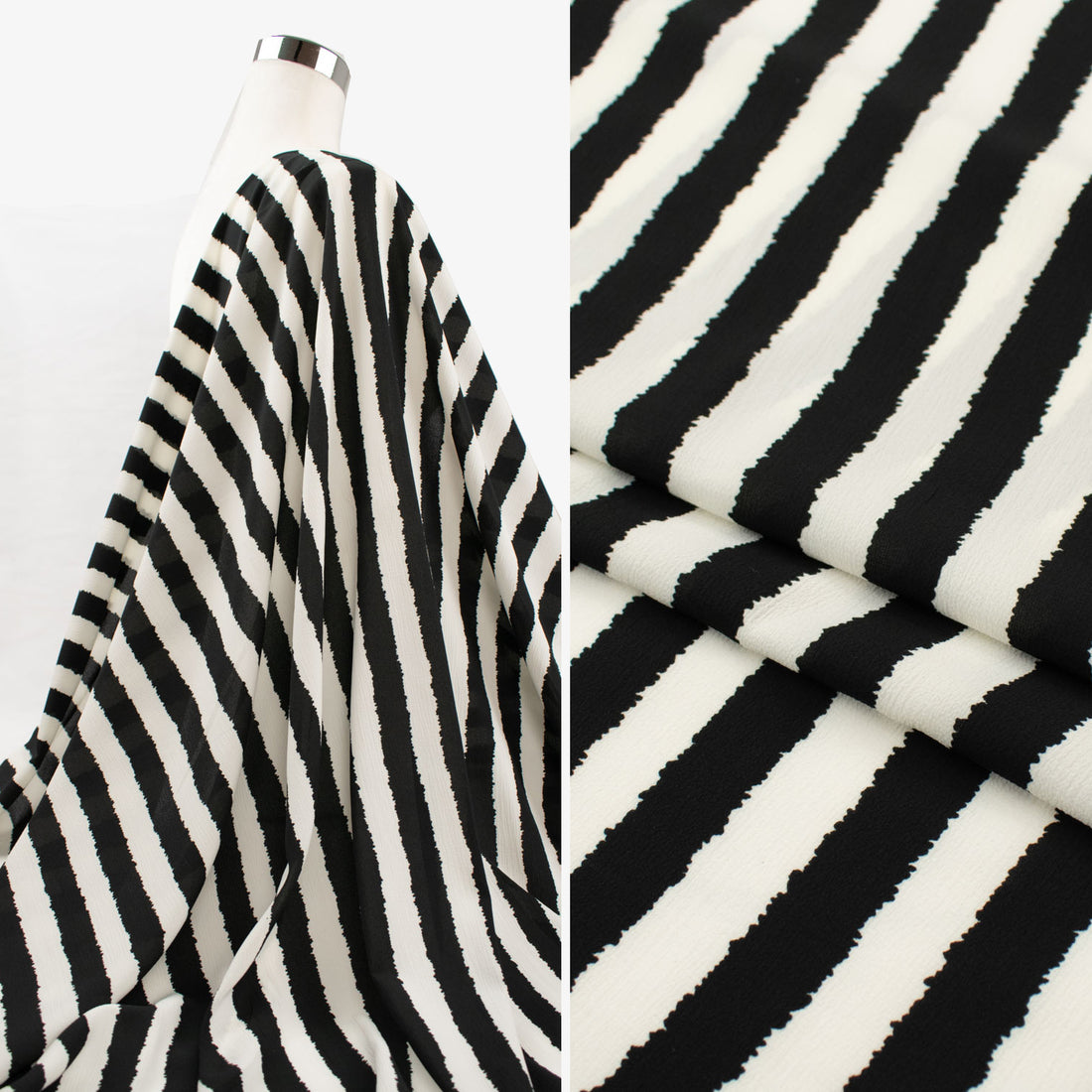 Content: 100% PolyesterWidth: 140CMWeight: 110GSM Discover our Striped Printed Crepe Georgette fabric! With its semi-sheer texture, fluid drape, and...