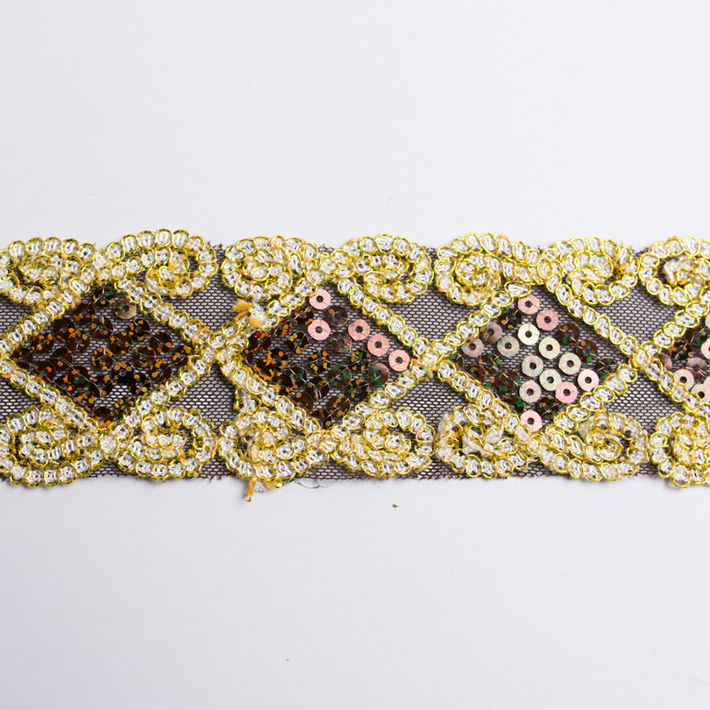 A selection of lurex embroidered sequin laces. Can be used to decorate dance wear, sari, evening wear, crafts projects, clothing, curtaining and upholstery projects.