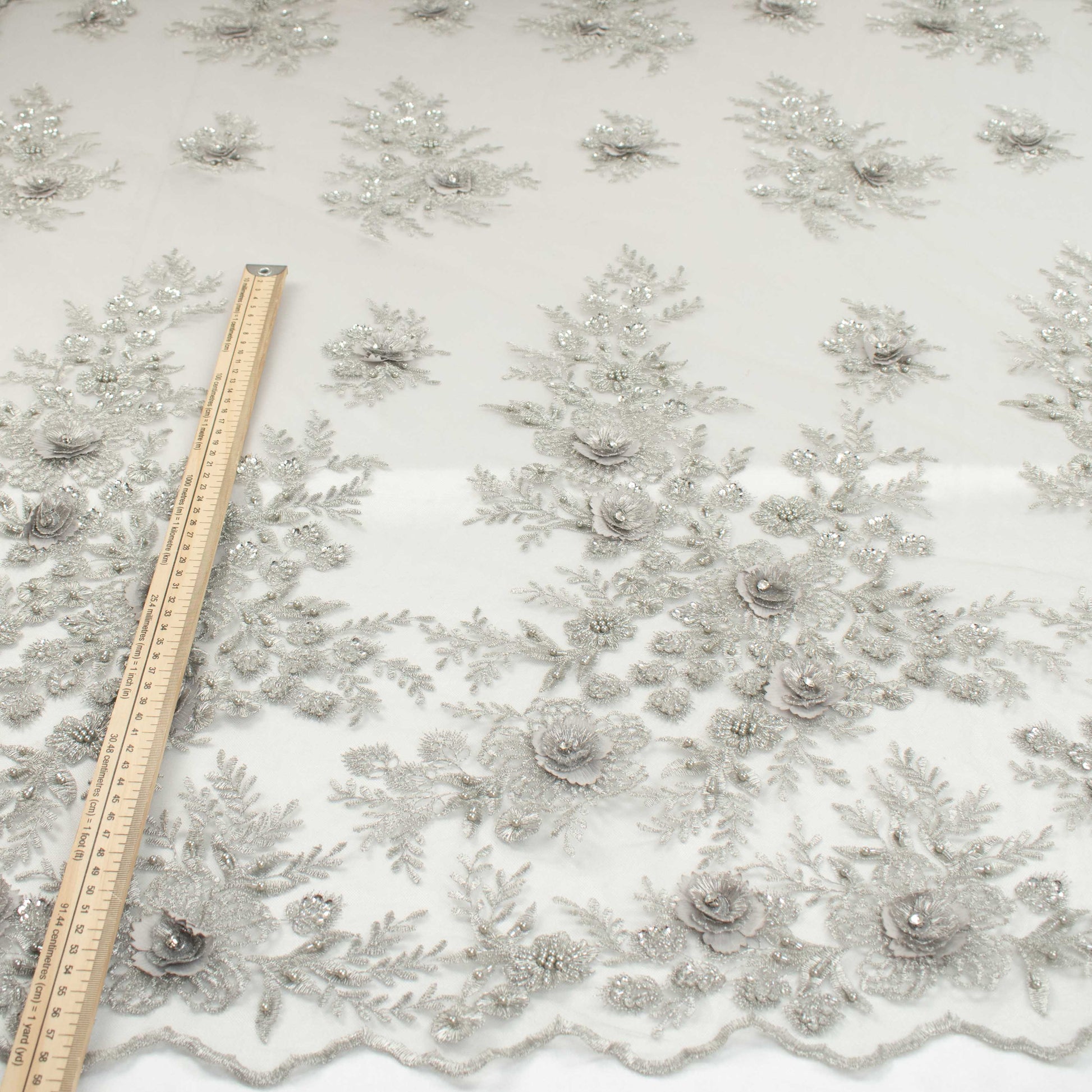 Diamante 3D Roses With Pearl Beaded Sequins Lace Silver 128CM Wide