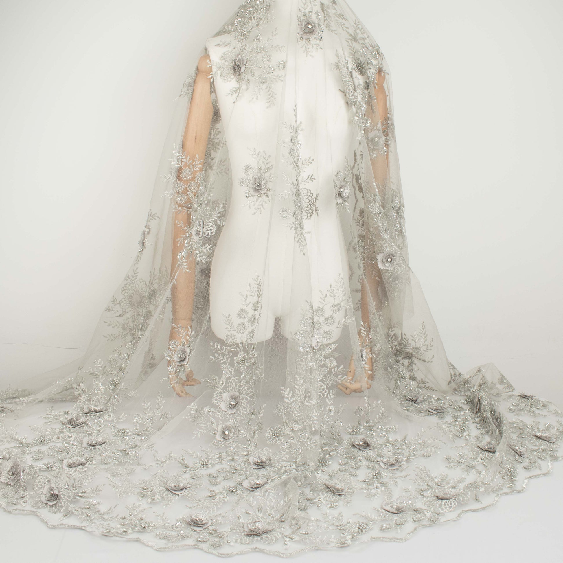 Diamante 3D Roses With Pearl Beaded Sequins Lace Silver