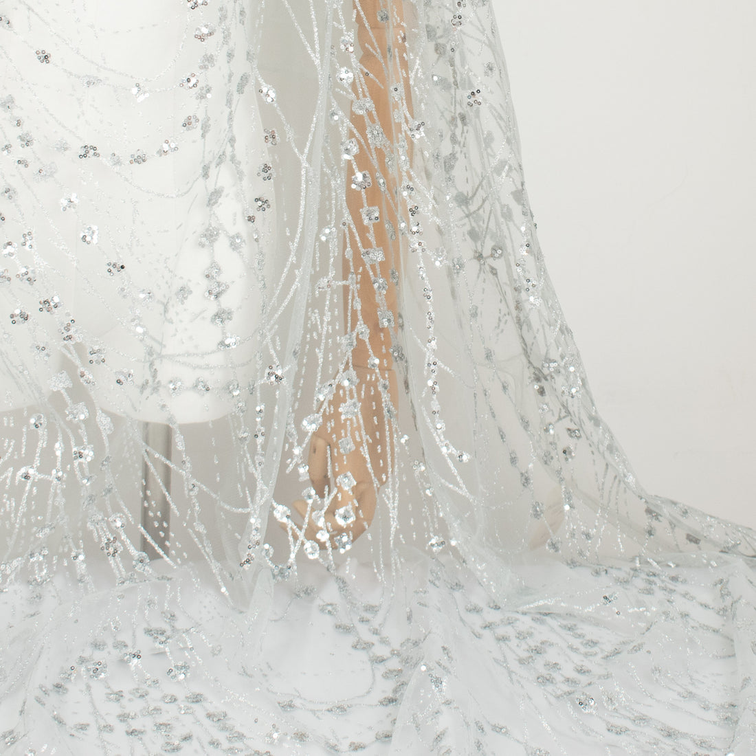 Content: 100% Polyester Width: 130cm An embroidered sequin on a soft tulle mesh open background. Reminiscent...