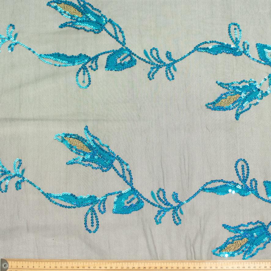 An embroidered sequin on a soft tulle mesh open background. Reminiscent of the opulent colors and intricate patterns of the orient this sequenced lace would be a perfect choice for dance costumes and cocktail wear. The tulle mesh background enables the lace to give a soft, floaty drape to your garment.