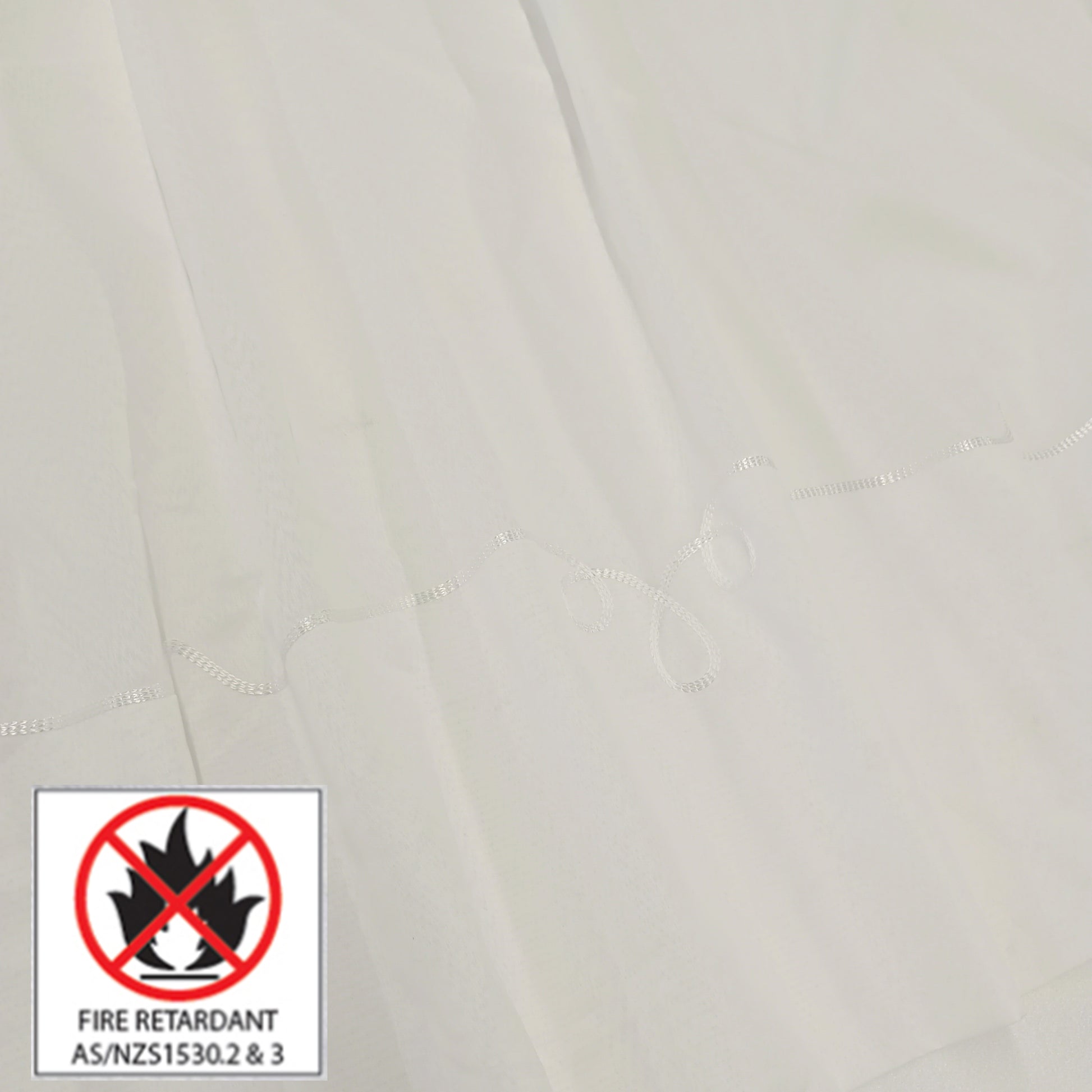 Roma II is a timeless frosty voile or sheer featuring a delicate embroidered border. Its fire-retardant properties make it perfect for commercial use, and it also works beautifully as event decorations for weddings and other occasions.