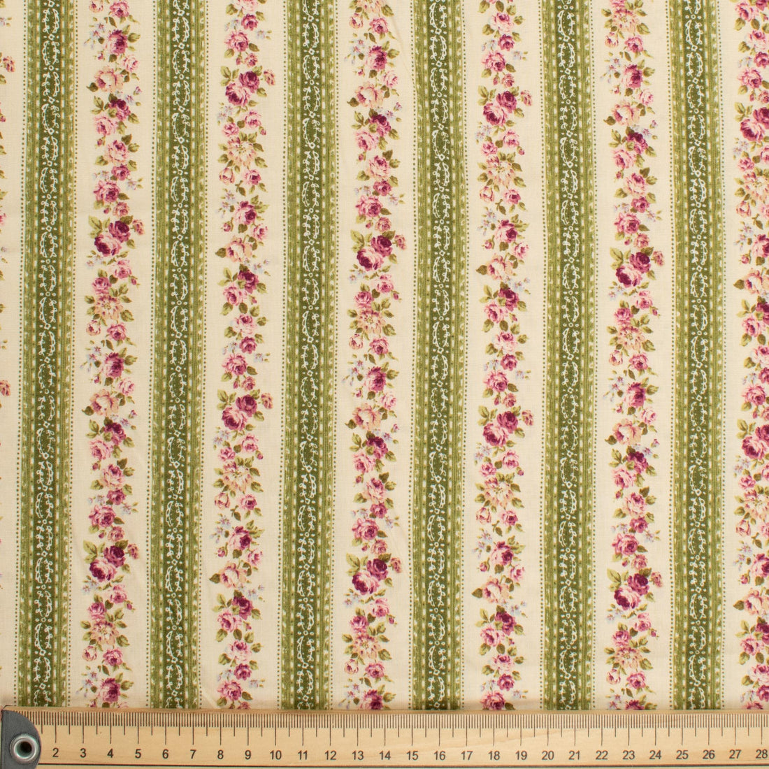 Stof Fabrics Roses-13 Floral on Cream & Green StripesCotton Prints