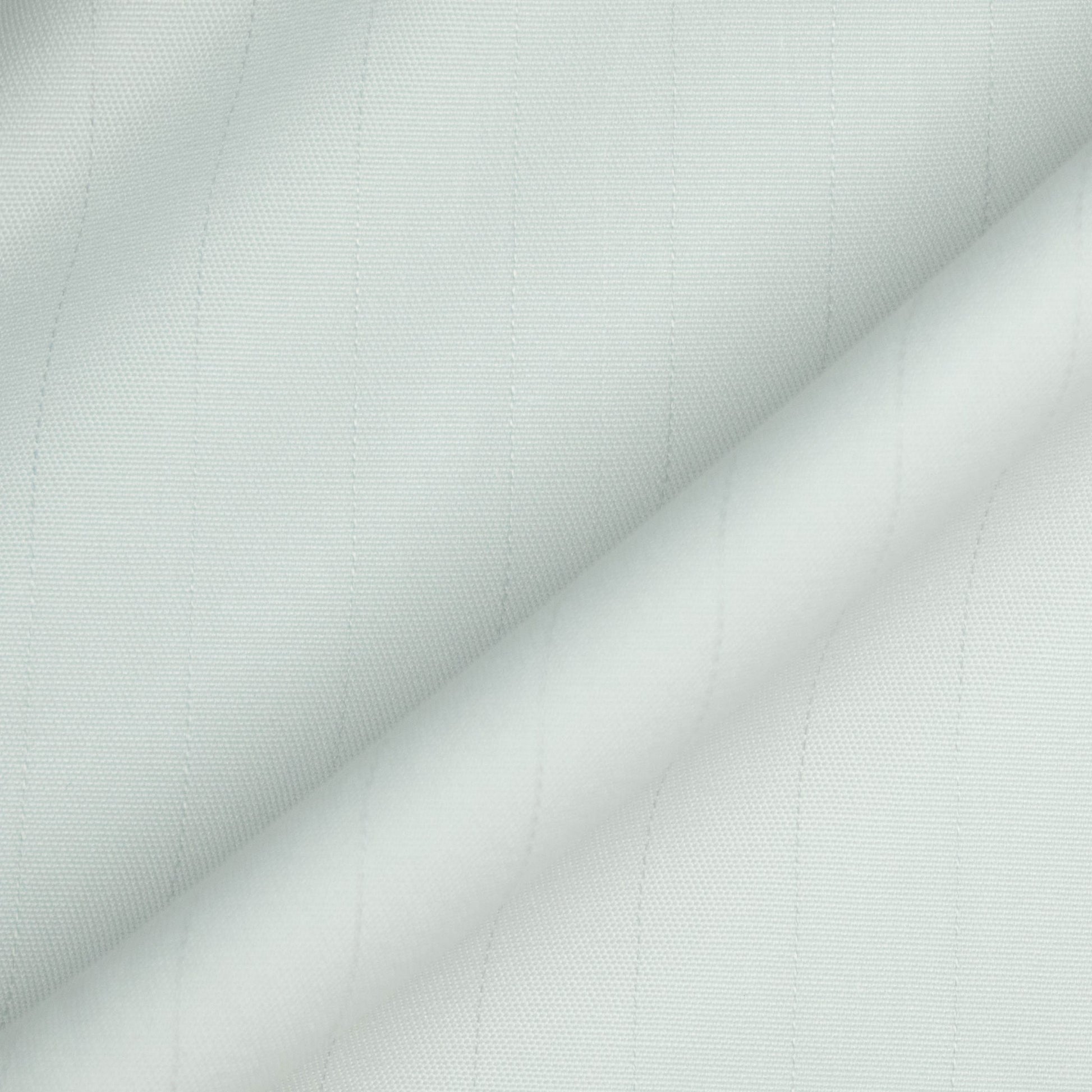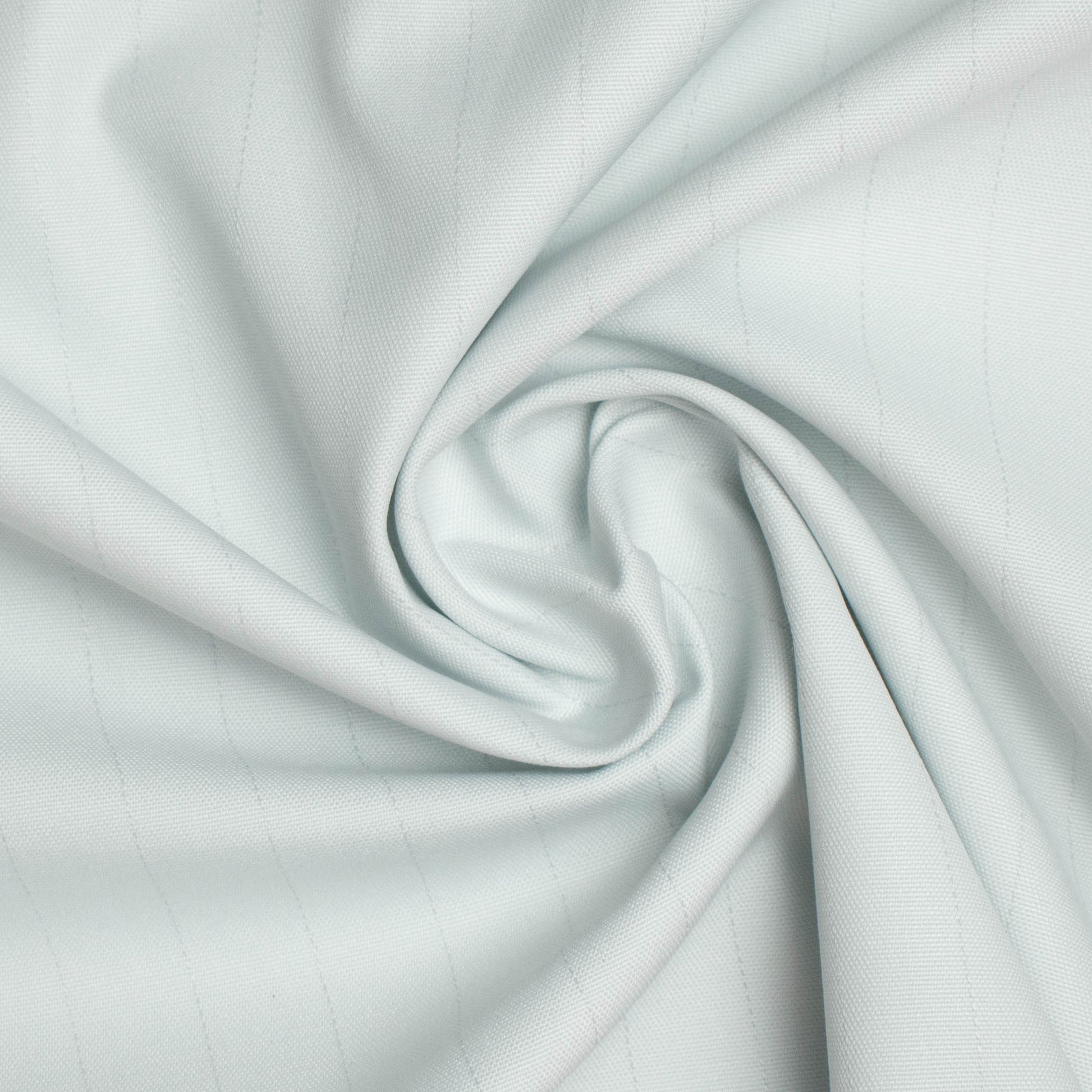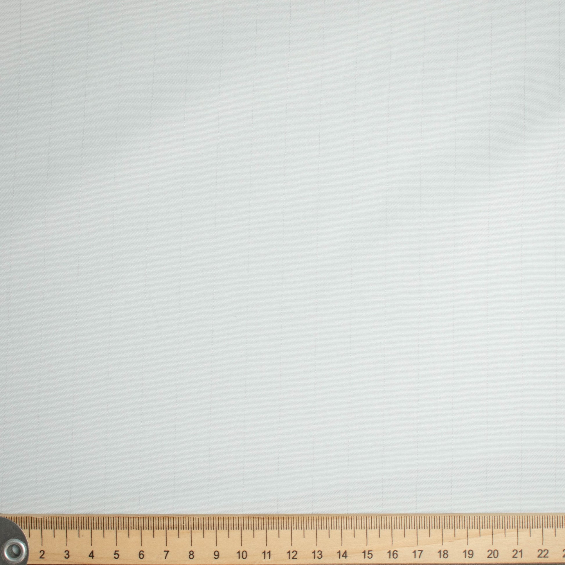 A snow white light to medium weight polyester suiting with a feint grey pinstripe. It has a smooth texture with a "microfibre feel". Can be used for trousers, skirts, shirts style dresses and culottes.