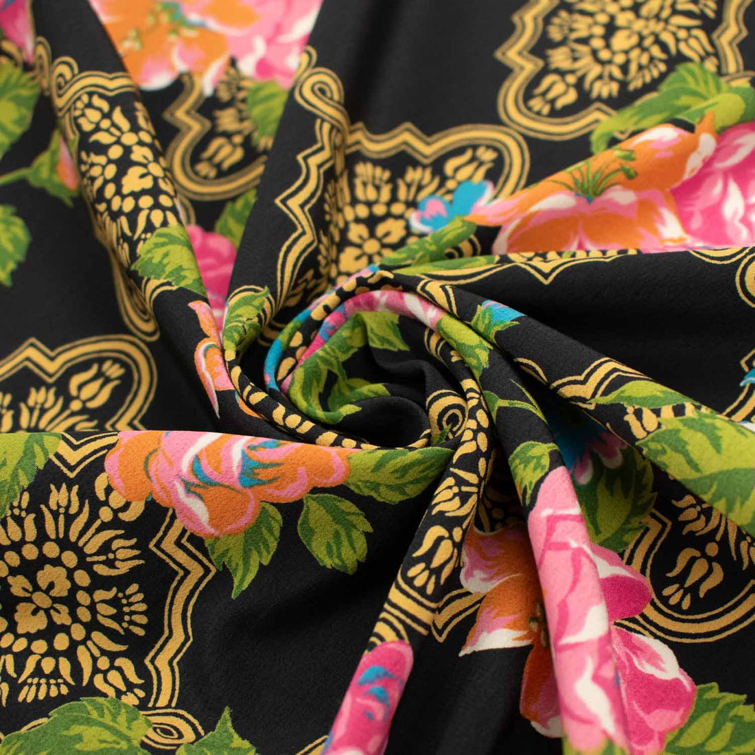 Printed Crepe Design-17 Vintage Chinese Traditional Pink & Orange Flowers on Black