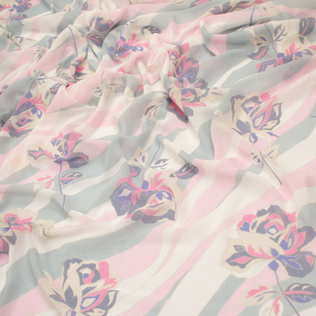Printed Chiffon Design-13 Pink & Grey Roses on Silver Waves