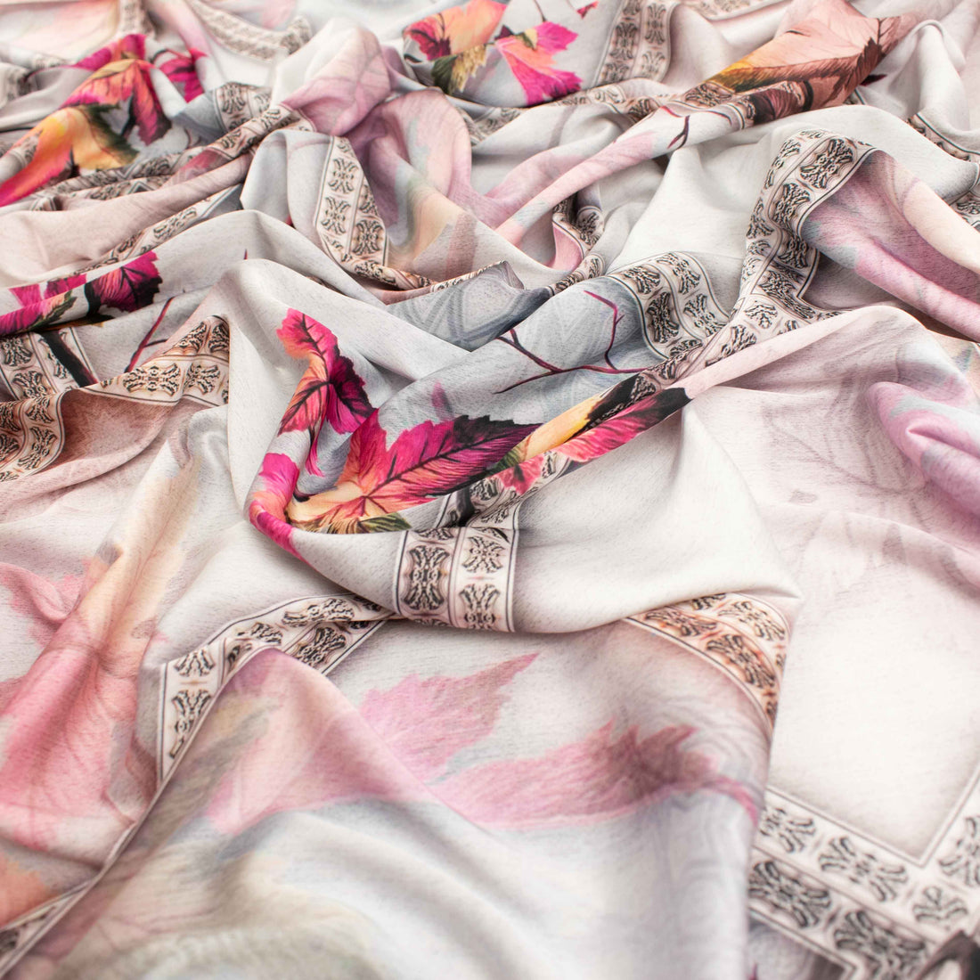 Digital Printed Satin Design-18 Pink Maple Leaves on Silver Checks