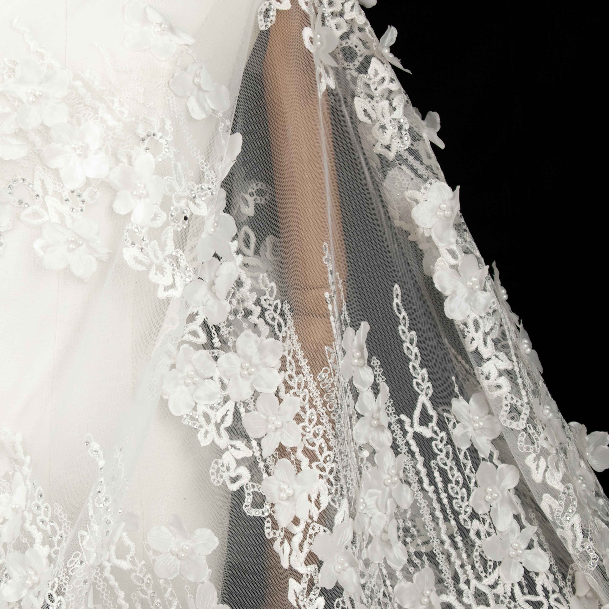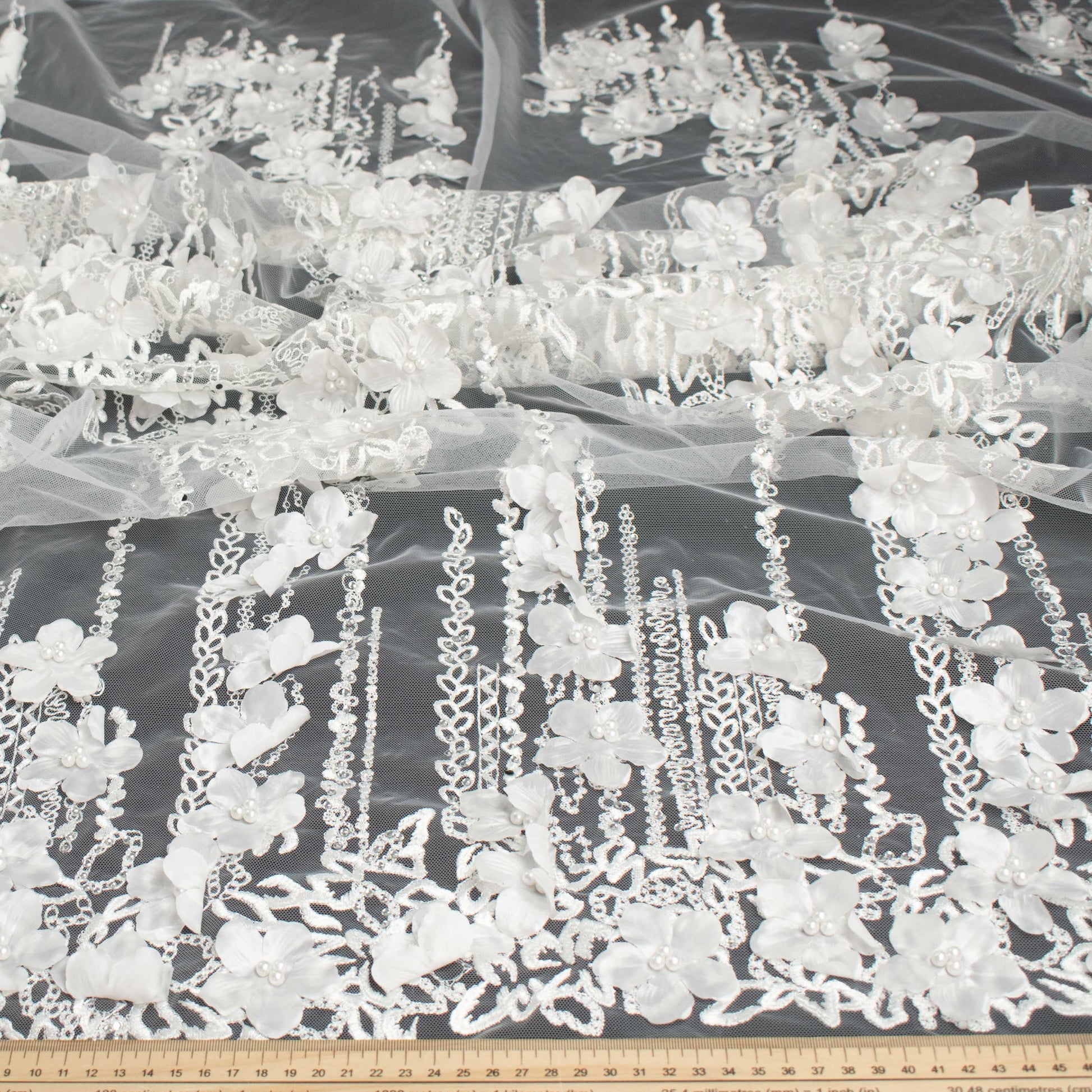 3D Flower Pearl Diamanta Embroidered Lace White