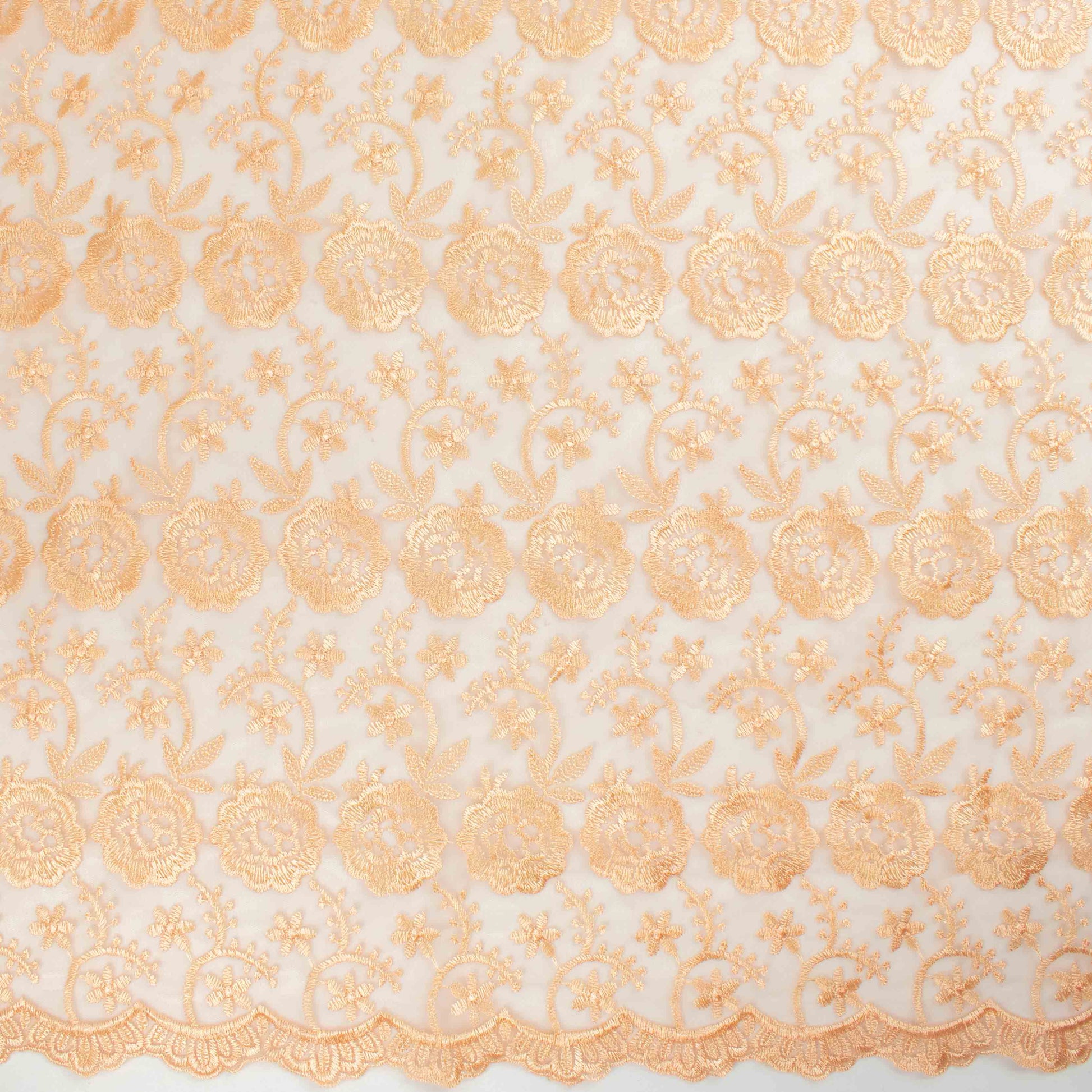 A densely Embroidered Lace on a tulle net backing with double scalloped edges. The embroidery comes in two sizes - A larger floral design and a smaller all over floral pattern. With over fifty colours to choose from, Our Embroidered Lace is the perfect choice for bridal wear, cocktail wear, evening wear as well as mother of the bride. Use a matching or contrasting colour from any of our beautiful Crepe Back Satins as an underlining to finish your garment.